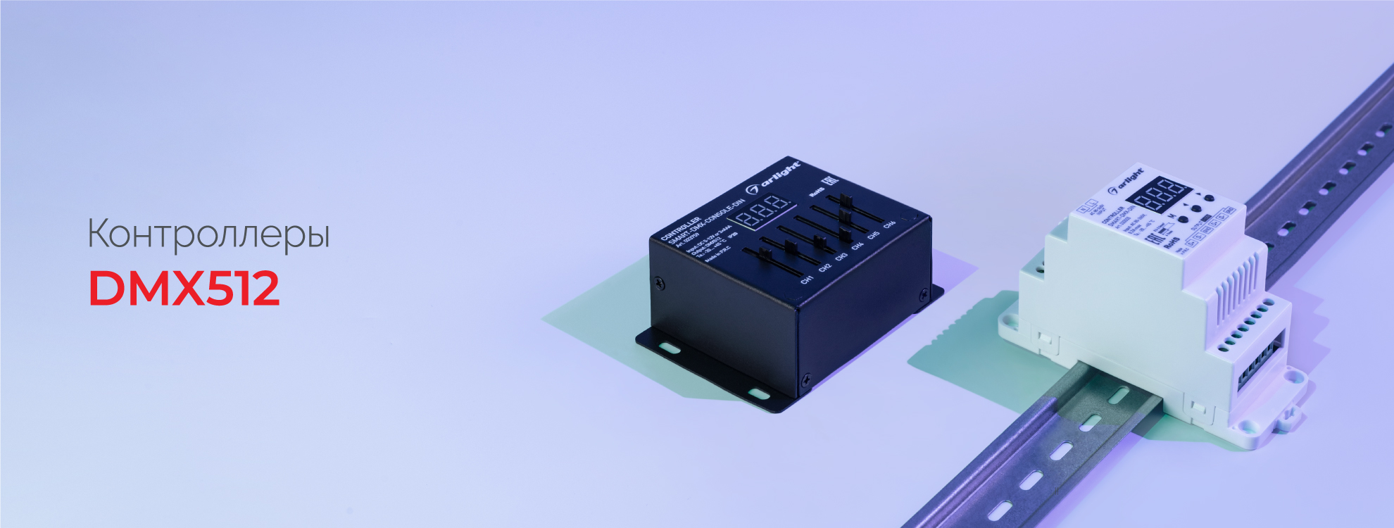 Контроллеры, использующие цифровой протокол DMX512. В зависимости от типа устройства могут формировать управляющий сигнал для декодеров DMX512 или управлять светодиодными лентами «бегущий огонь», светодиодными модулями и другими устройствами, поддерживающими протокол DMX512.