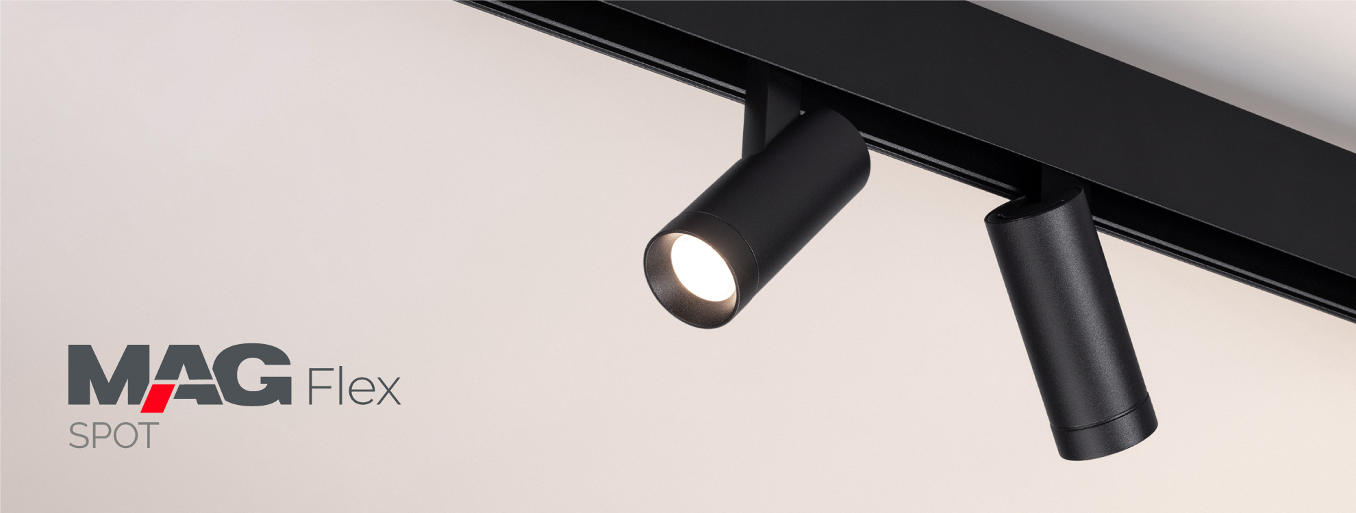 Светильник с поворотным механизмом в корпусе черного цвета. Светильники предназначены для установки в магнитную трековую систему (шинопровод) серии MAG-FLEX.
