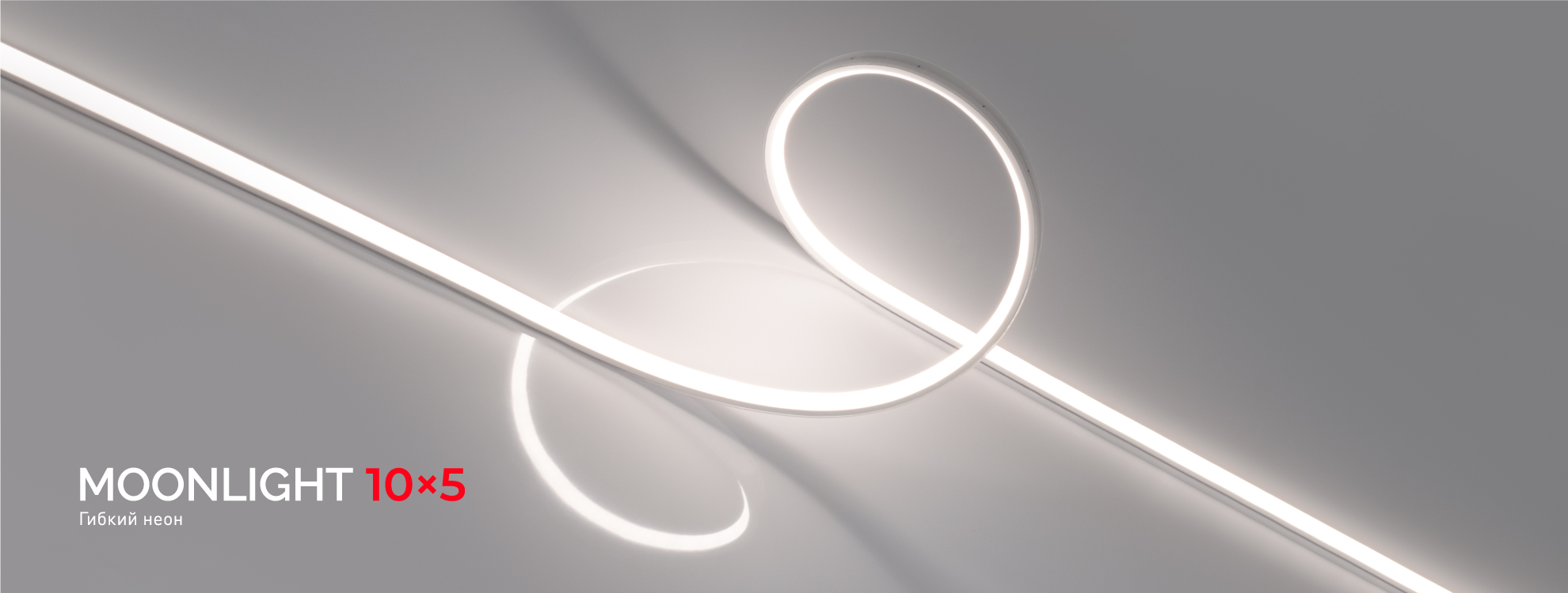 Гибкий неон MOONLIGHT с куполообразным сечением 10×5 мм — отличное решение для подсветки мебели, в том числе и во влажных помещениях, а также декоративного освещения.