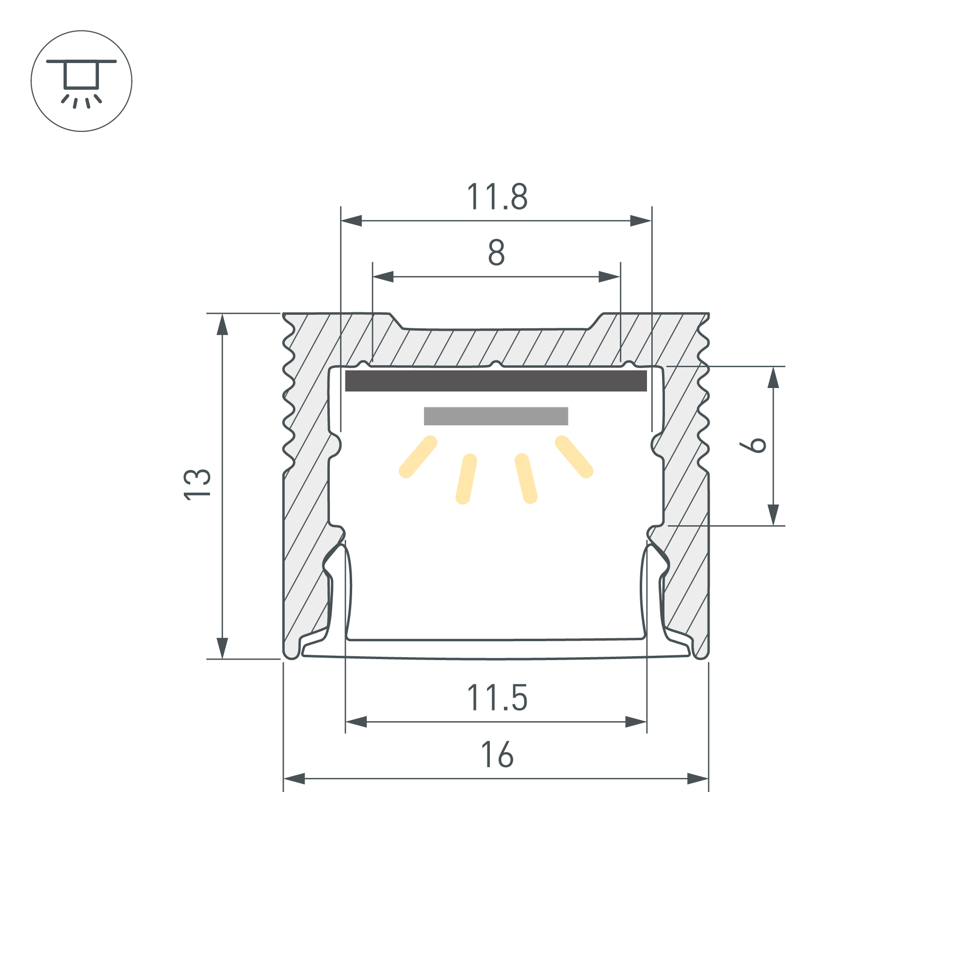 Алюминиевый анодированный светотехнический профиль специально предназначен для установки светодиодных лент или линеек. Габаритные размеры профиля составляют 3000 мм в длину, 16 мм в ширину и 13 мм в высоту. Площадка для установки светодиодных лент позволяет использовать ленту шириной до 11,8 мм и мощностью до 15,2 Вт/м. Профиль применяется для создания декоративного освещения в интерьерах. Монтаж осуществляется накладным способом. Предлагаются дополнительные аксессуары (экраны, заглушки и т.д.), позволяющие создать готовый светильник.