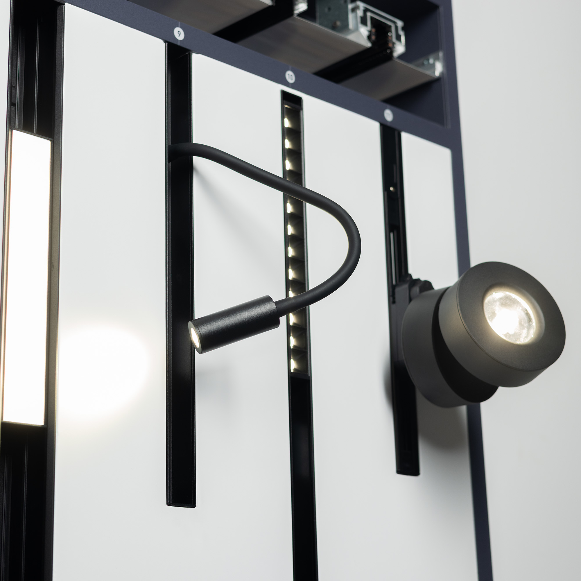 На стенде представлен ассортимент профилей Arlight для натяжных потолков: Профиль серии FOLED, совмещающий в своей конструкции каркас для крепления натяжного потолка и профиль для установки светодиодной ленты. Профиль-держатель MAG STRETCH для установки магнитных треков в натяжной потолок.