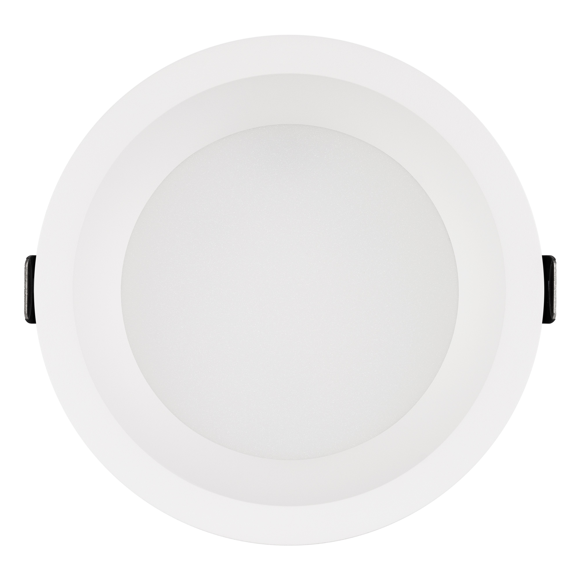 Встраиваемый светильник даунлайт. Мощность 30 Вт, св. поток 2950 лм, 98 лм/Вт, дневной 4000 K, CRI>90, угол 90°, напряжение питания 230 В. Белый круглый корпус из алюминия, степень защиты IP54. Размер: диаметр 158 мм, высота 72 мм. Монтаж встраиваемый, установочное отверстие: диаметр 145 мм. Драйвер IP54, 27-43 В, 800 мА, пульсация <2%.