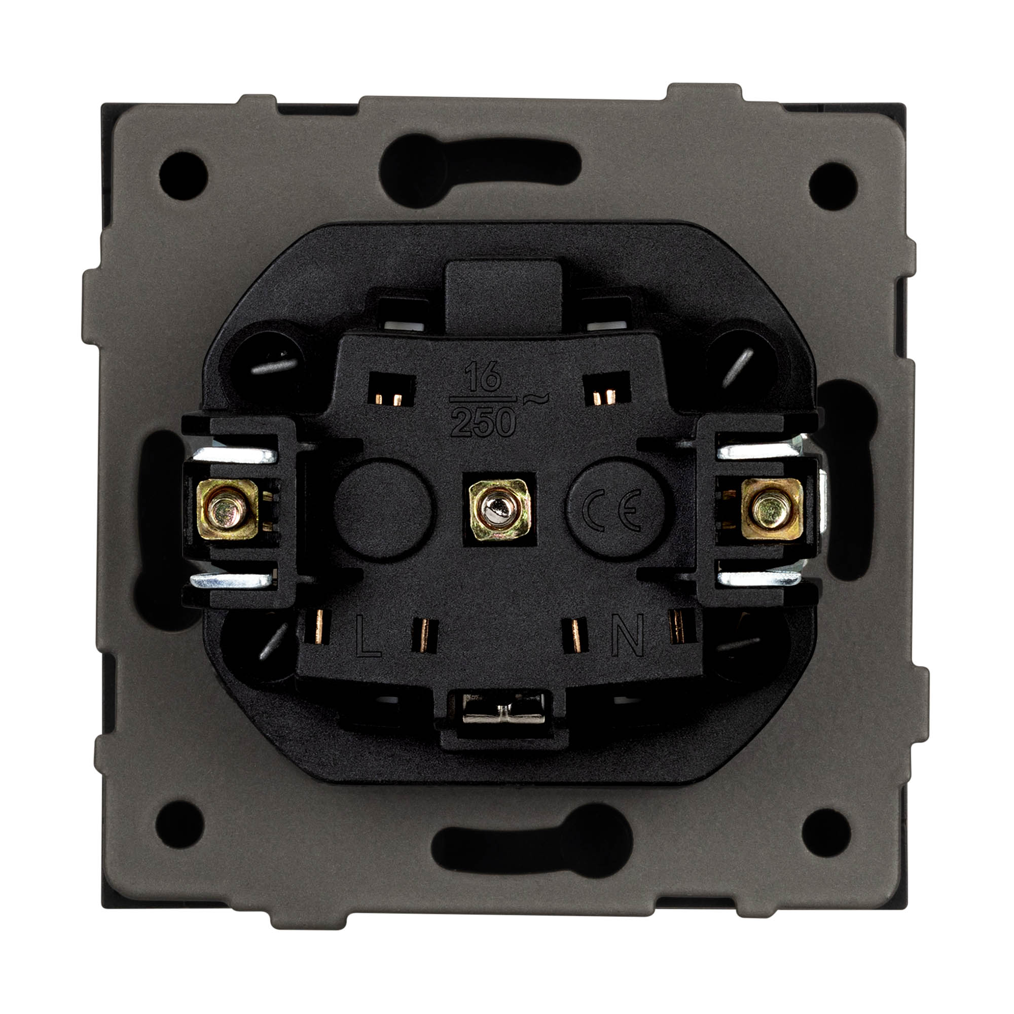Механизм розетки с заземлением на 1 пост. Цвет - серый, с Soft-Touch покрытием. Без фронтальной рамки. Уровень пылевлагозащиты IP20. Розетка устанавливается в стандартный подрозетник круглого сечения диаметром 60мм.