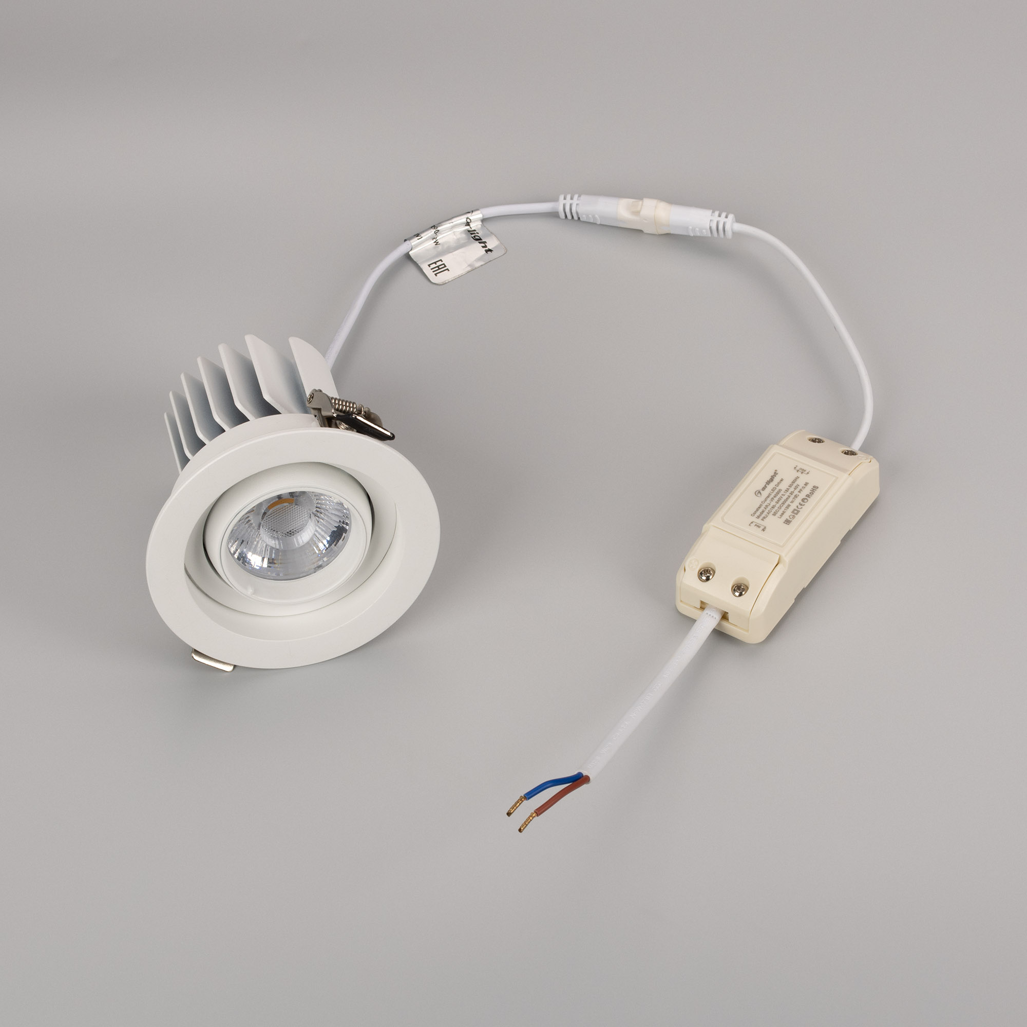 Встраиваемый карданный светильник. Мощность 12 Вт, св. поток 1318 лм, 109 лм/Вт, тёплый 3000 K, CRI>92, угол 20°, напряжение питания 230 В. Белый корпус из алюминия, белая вставка, степень защиты IP20. Размер: диаметр 90мм, высота 80 мм. Монтаж встраиваемый, установочное отверстие: диаметр 75мм. Драйвер 27-40 В, 300 мА, пульсация <2%.
