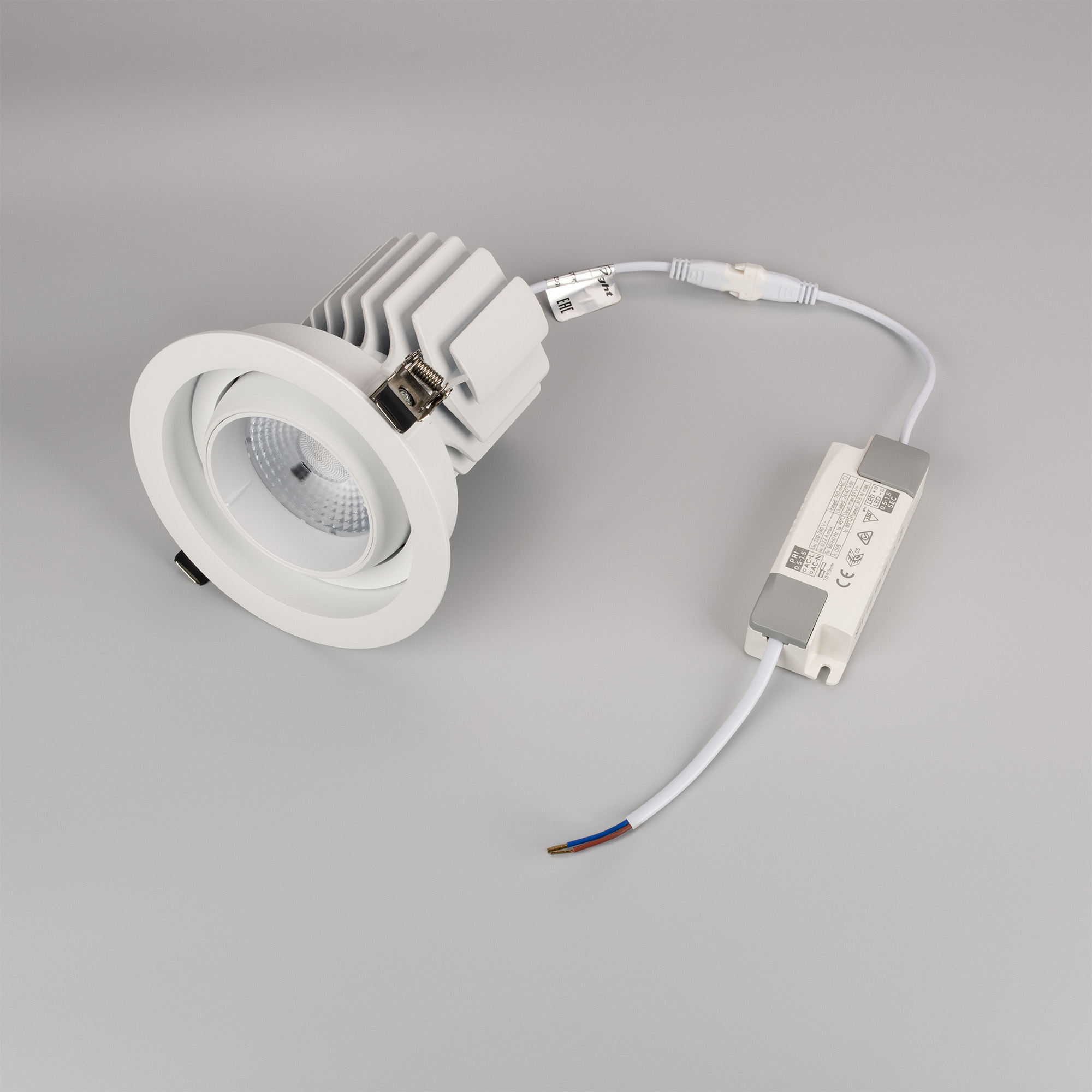 Встраиваемый карданный поворотный светильник с высоким индексом цветопередачи CRI>92 предназначен для создания качественного освещения. За основу поворотного механизма светильника взят принцип кардана – подвижное соединение двух колец, вложенных одно в другое. Световой модуль вращается вокруг своей оси на 360 градусов и отклоняется от горизонта на 30 градусов, что позволяет с лёгкостью регулировать направление пучка света и его концентрацию на определенной зоне. Особая конфигурация корпуса из алюминия оригинально смотрится в интерьере и позволяет эффективно отводить тепло. Светильник с углом рассеивания 50 градусов отлично подходит как для локальной акцентной подсветки витрин, прилавков магазинов, бутиков и стендов выставочных залов, так и для общего освещения. Легко устанавливается с помощью пружин в монтажное отверстие потолка. В комплекте поставляется драйвер, что позволяет безопасно и быстро подключать светильник напрямую к сети переменного тока 230 В.