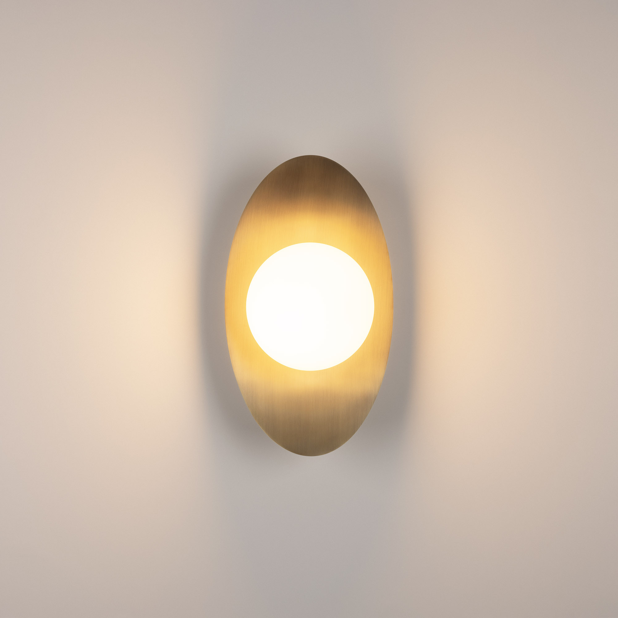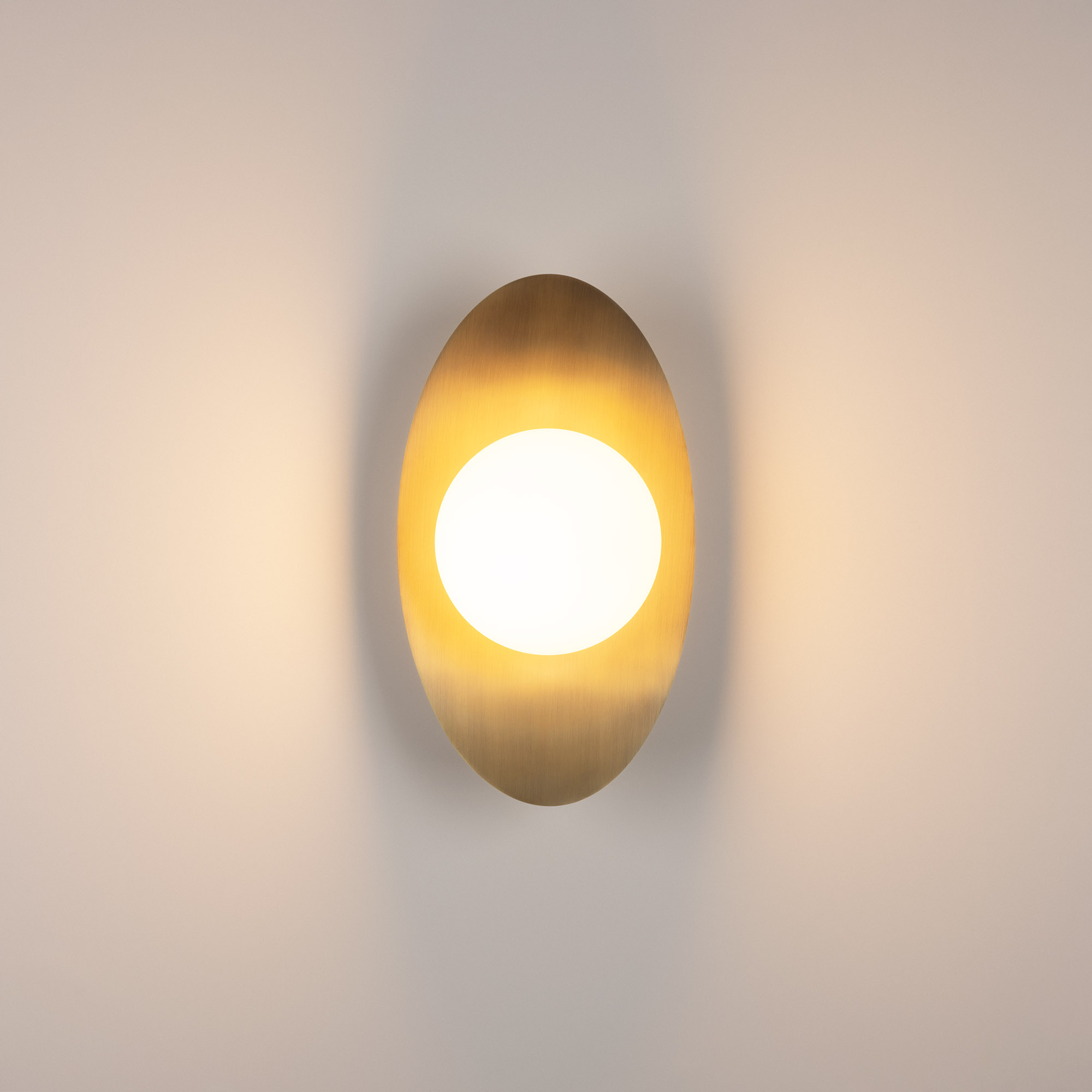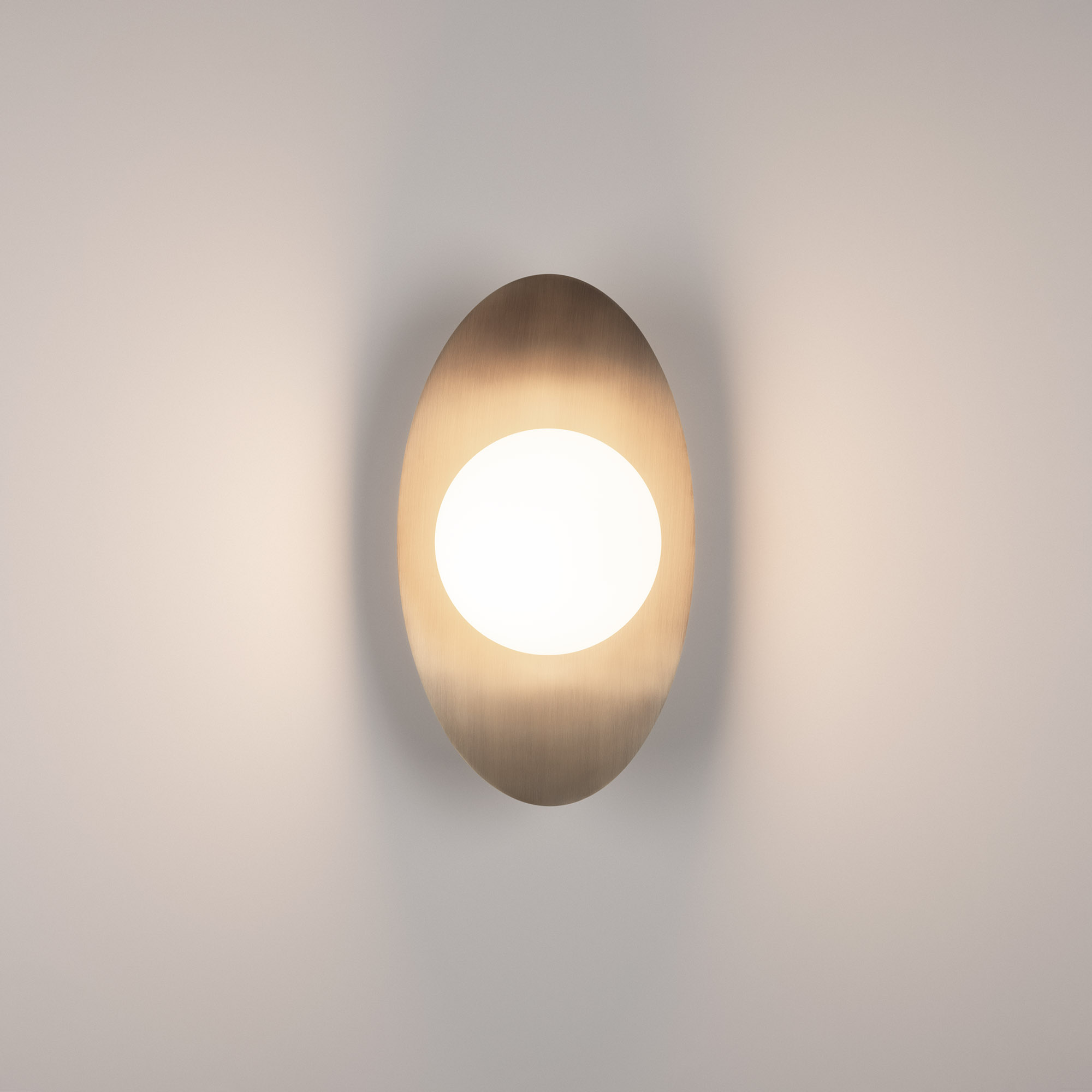Декоративный настенный светильник. Мощность 6 Вт, св. поток 325-340 лм, 50-52 лм/Вт, теплый 2700 K,теплый 3200К, дневной 4000 K (переключаются), CRI>92, угол 150°, напряжение питания 230 В. Фигурный корпус из алюминия, гальванизированного в цвет бронза, экран из матового стекла, степень защиты IP20. Размер: габариты световой части: Ø145x70 мм, габариты чаши: Ø110 x 42 мм. Монтаж накладной. Встроенный блок питания: 12В DC, 0,75А, пульсация <2%. Встроенный диммер TOUCH-DIM.