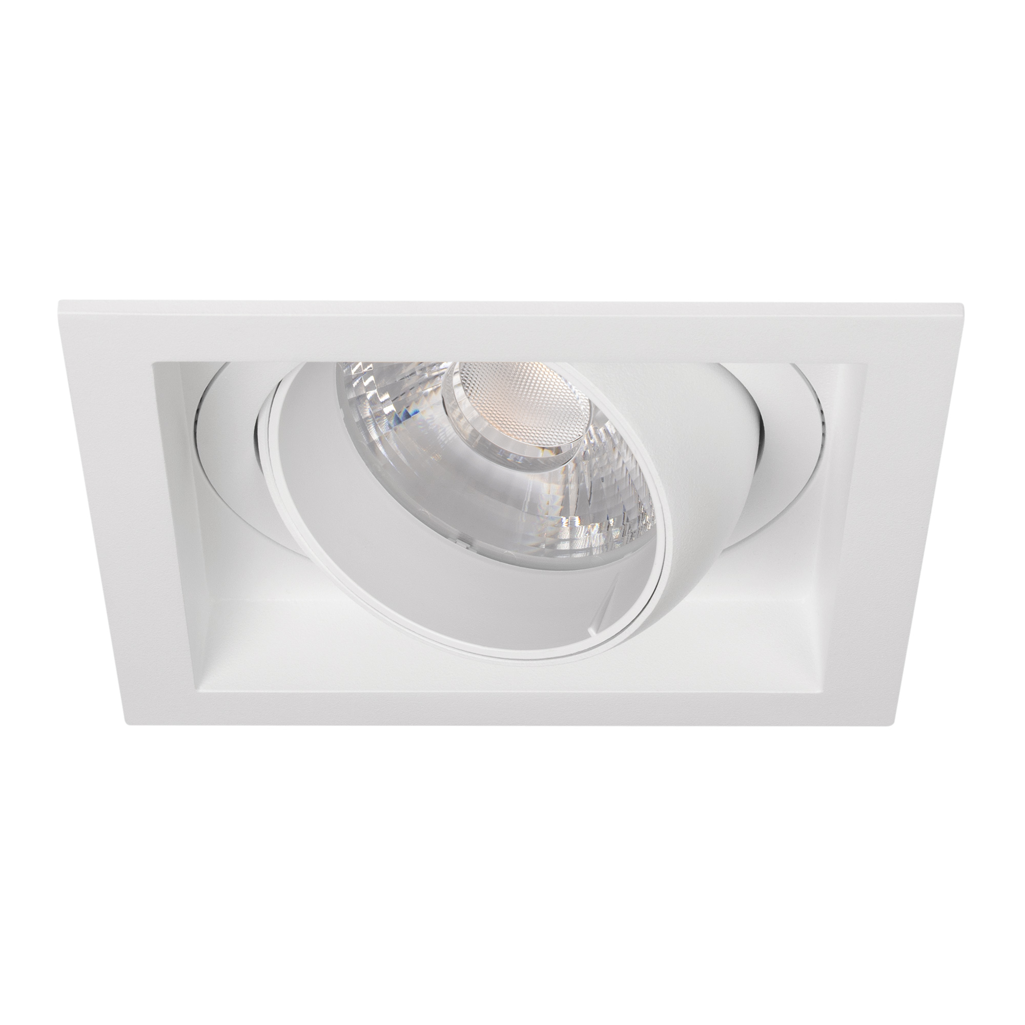 Встраиваемый карданный светильник. Мощность 30 Вт, св. поток 3104 лм, 103 лм/Вт, тёплый 3000 K, CRI>92, угол 17°, напряжение питания 230 В. Белый корпус из алюминия, белая вставка, степень защиты IP20. Размер: диаметр 135 мм, высота 125 мм. Монтаж встраиваемый, установочное отверстие: диаметр 120 мм. Драйвер 24-42 В, 750 мА, пульсация <2%.