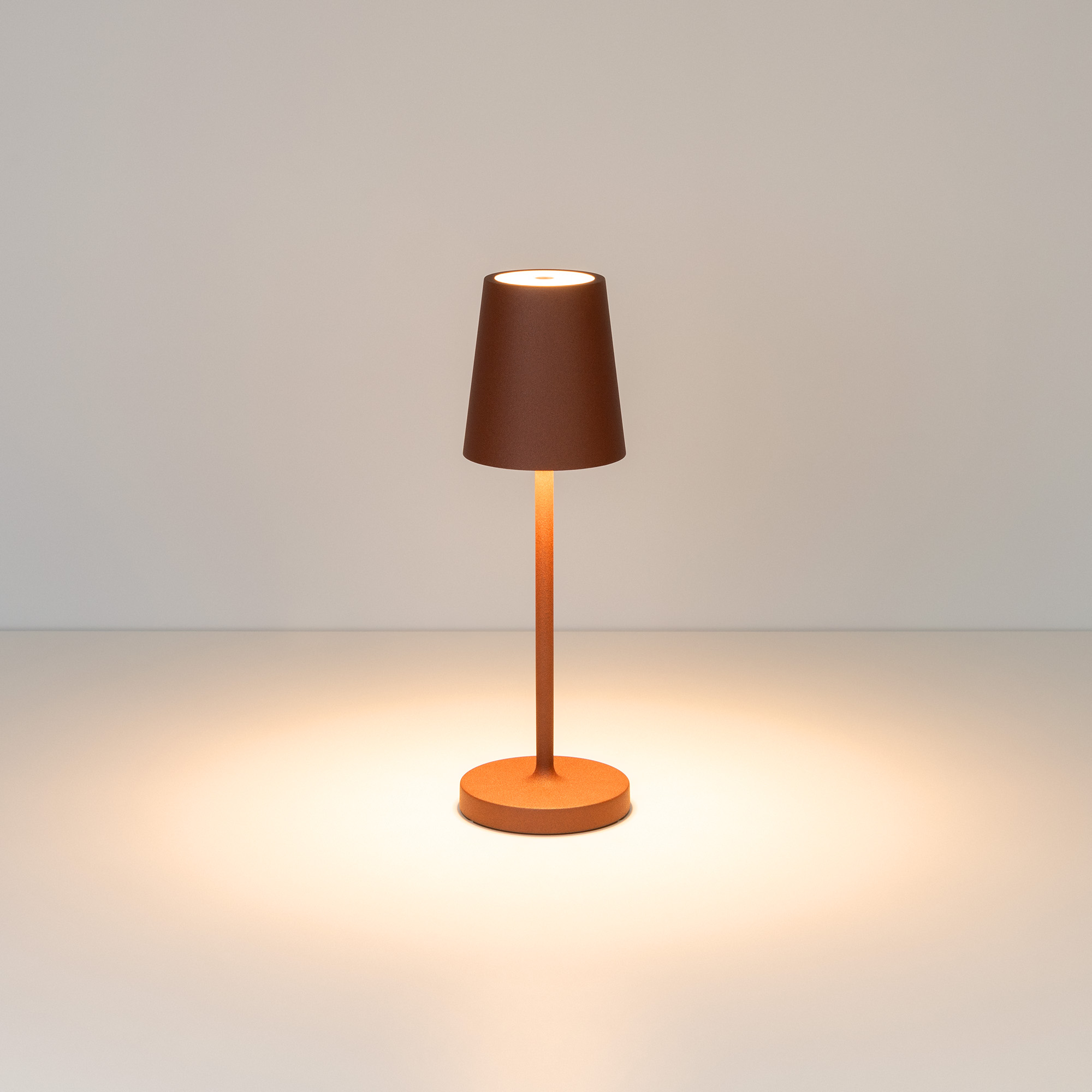 Настольный светильник со встроенным аккумулятором 1.5Вт, алюминиевый корпус, цвет терракотовый. Цвет ТЕПЛЫЙ БЕЛЫЙ 2200-2700-3000K, св.поток 110-130 лм, CRI(Ra)>80, угол 90°. Размер Ф75x250мм. IP54. Зарядка от сети переменного тока AC220-240V. Тип встроенного аккумулятора 1500мАч Li-ion, напряжение батареи 3.7V