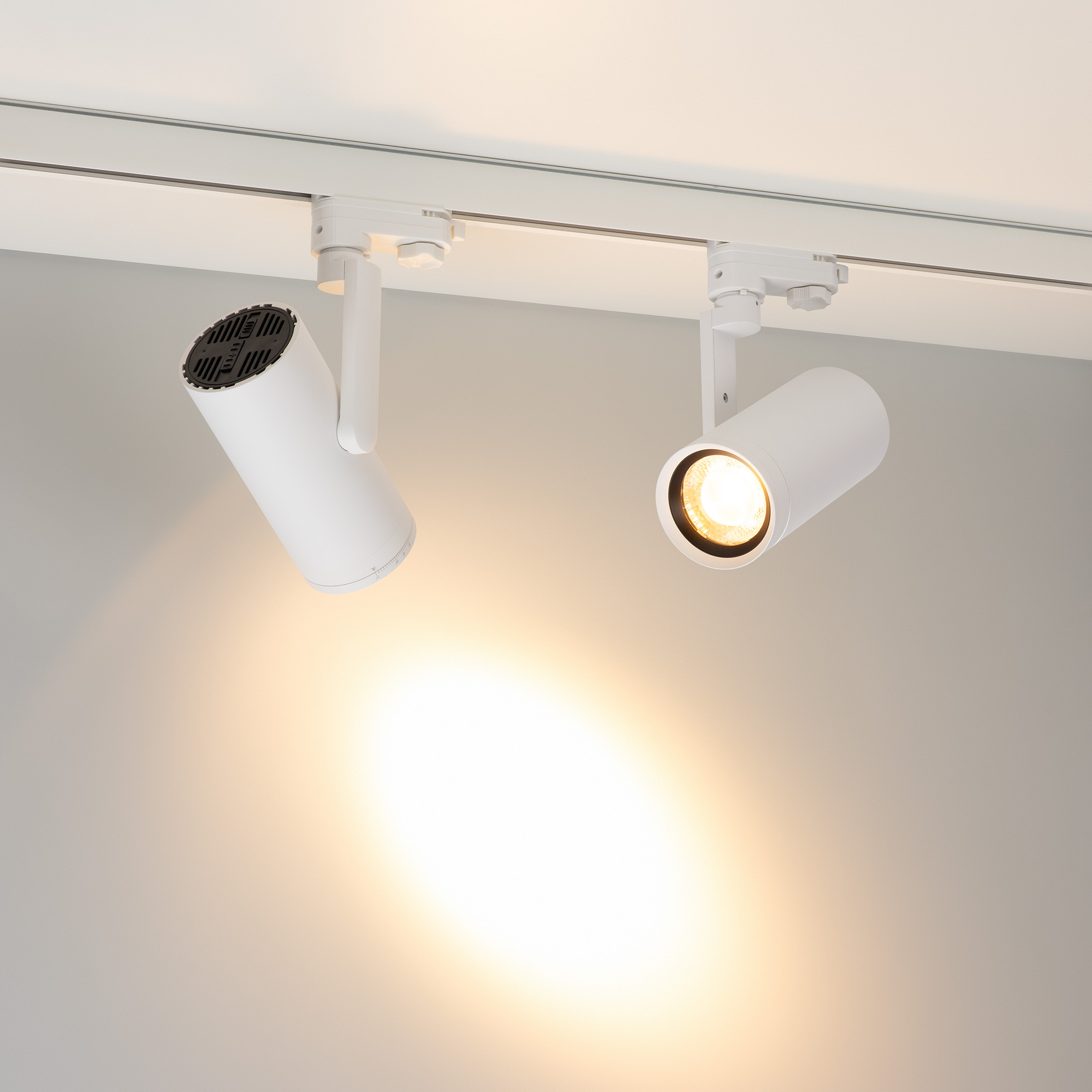 Светильник для треков/шин 4 провода, 18Вт/25Вт. Цвет свечения меняется в диапазоне 2700K/3000K/3500K/4000K/5700K (при помощи переключателя на корпусе), световой поток 1140-2075лм, регулируемый угол 20°-50°, CRI>90. Корпус круглый, металл, цвет черный, IP20. Угол наклона корпуса 90°, угол поворота корпуса 330°. Габариты LxWxH: 90х75x255мм. Размер модуля DxL: 75x165мм. Входное напряжение AC220-240V, мощность 25Вт.