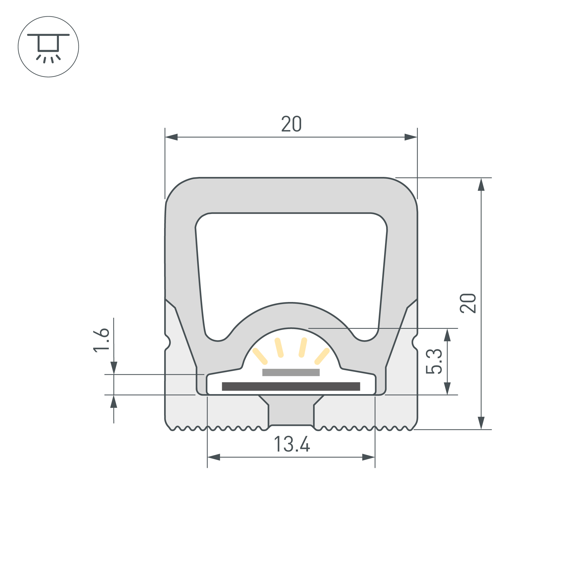 Цельнолитой силиконовый гибкий профиль белого цвета. Габаритные размеры профиля составляют 10000 мм в длину, 20 мм в ширину и 20 мм в высоту. Вертикальный изгиб TOP, минимальный радиус изгиба 60 мм. Угол излучения 140°. Для удобства установки ленты по всей длине профиля протянута нить. Площадка для установки светодиодных лент позволяет использовать ленту шириной от 10 до 12 мм, высотой до 4 мм и мощностью до 10 Вт/м. Это обеспечивает гибкость в выборе светодиодных лент и создает потрясающие световые решения. Для установки во влажных помещениях необходима герметизация при помощи двухкомпонентного эпоксидного герметика. Класс пылевлагозащиты – IP65 (при соблюдении технологии герметизации). Этот продукт представляет отличное решение для создания современных световых проектов и обеспечивает надежную и стильную основу для установки светодиодов. Для накладного монтажа на 1 метр профиля рекомендуем использовать не менее 3-х держателей. Подходит только для установки внутри помещения