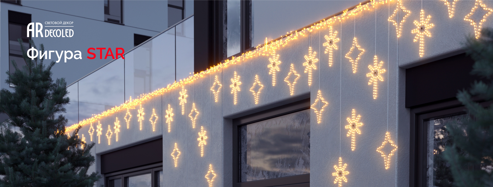 Двухмерные фигуры «Звездочка» из дюралайта помогут создать праздничное настроение в интерьере кафе или магазинов, а также на фасадах зданий и верандах под навесом.