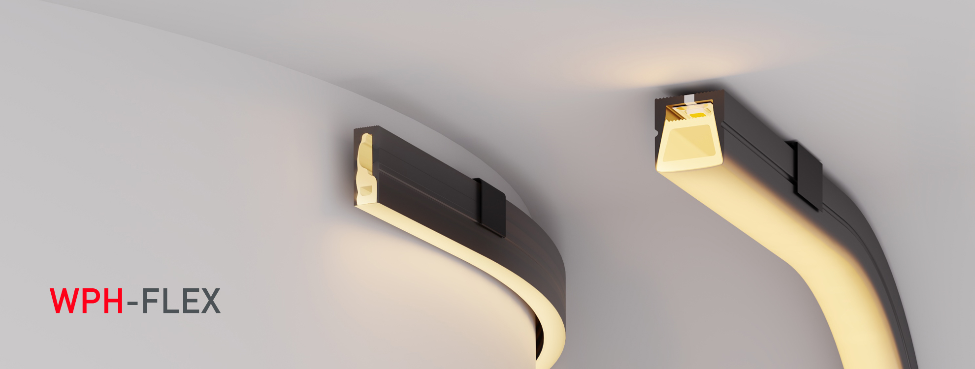 В серии WPH FLEX вы найдете профили с прямоугольной и круглой формой сечения. Ассортимент прямоугольных профилей представлен моделями с разными размерами сечения и возможностью как вертикального (TOP), так и горизонтального изгиба (SIDE). Гибкие круглые профили со свечением 360° имеют диаметр 22 и 40 мм. Модели с диаметром 22 мм представлены не только в белом и черном цвете, но и в оплетке из нейлоновой нити.