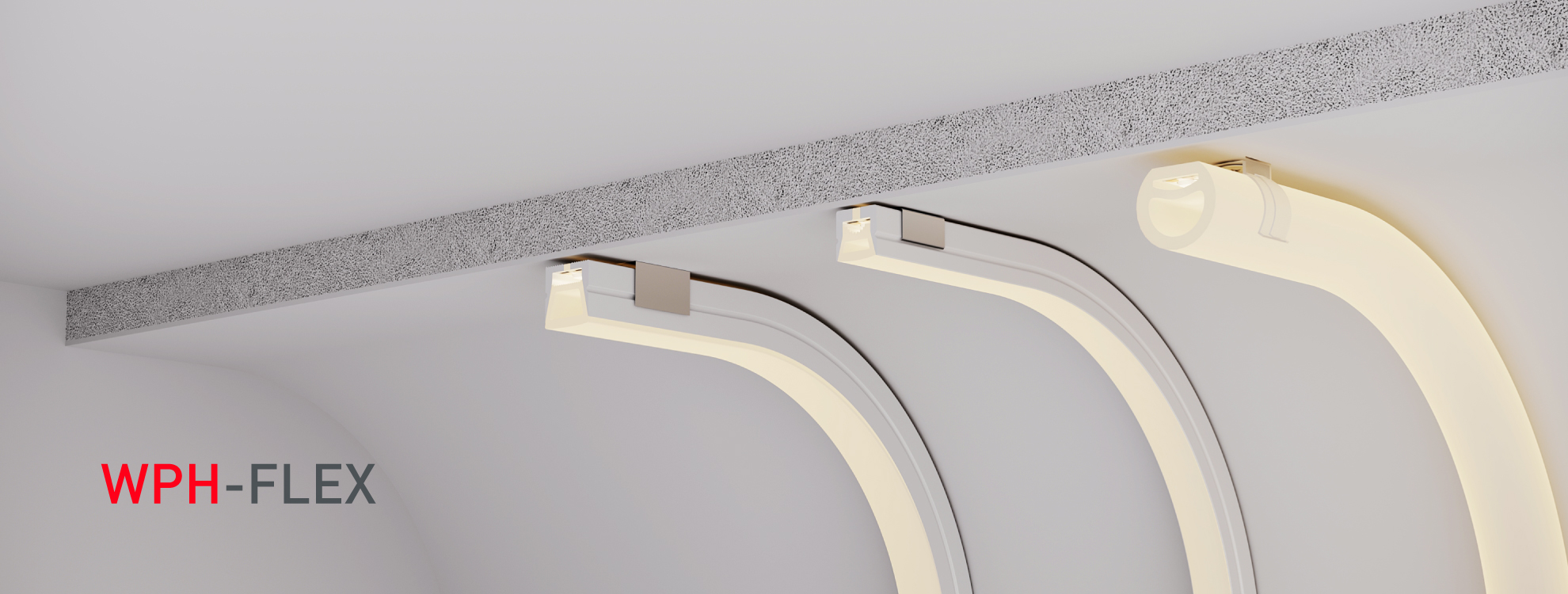 Линии света на основе гибкого силиконового профиля WPH FLEX подчеркнут не только плавные изгибы, но и прямую геометрию в интерьере и архитектуре. Профили поставляются в катушках по 5, 10, 20 и 50 м.