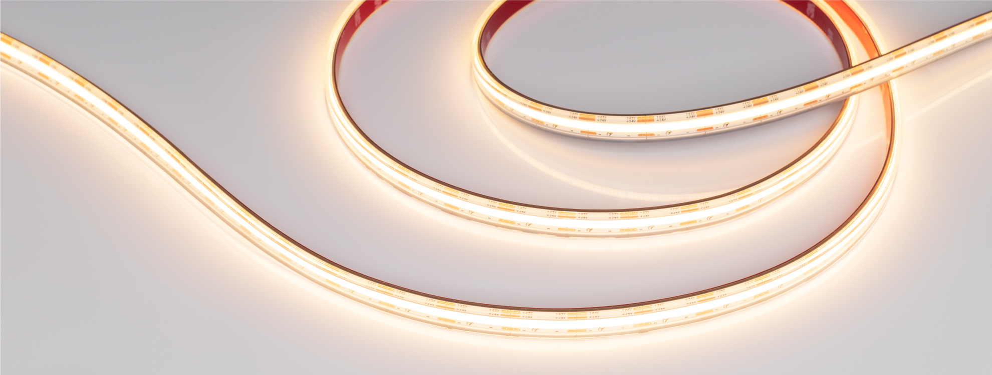 Уютное, качественное освещение для вашего пространства. Серия X560 светодиодных лент COB PS — это равномерное свечение по всей длине без применения рассеивающих экранов и подключение до 10 м с одной стороны. Ленты обеспечивают декоративную подсветку МОП в больших коммерческих, офисных и жилых помещениях с гарантированной защитой от влаги и внешних воздействий благодаря высокой степени пылевлагозащиты (IP67).