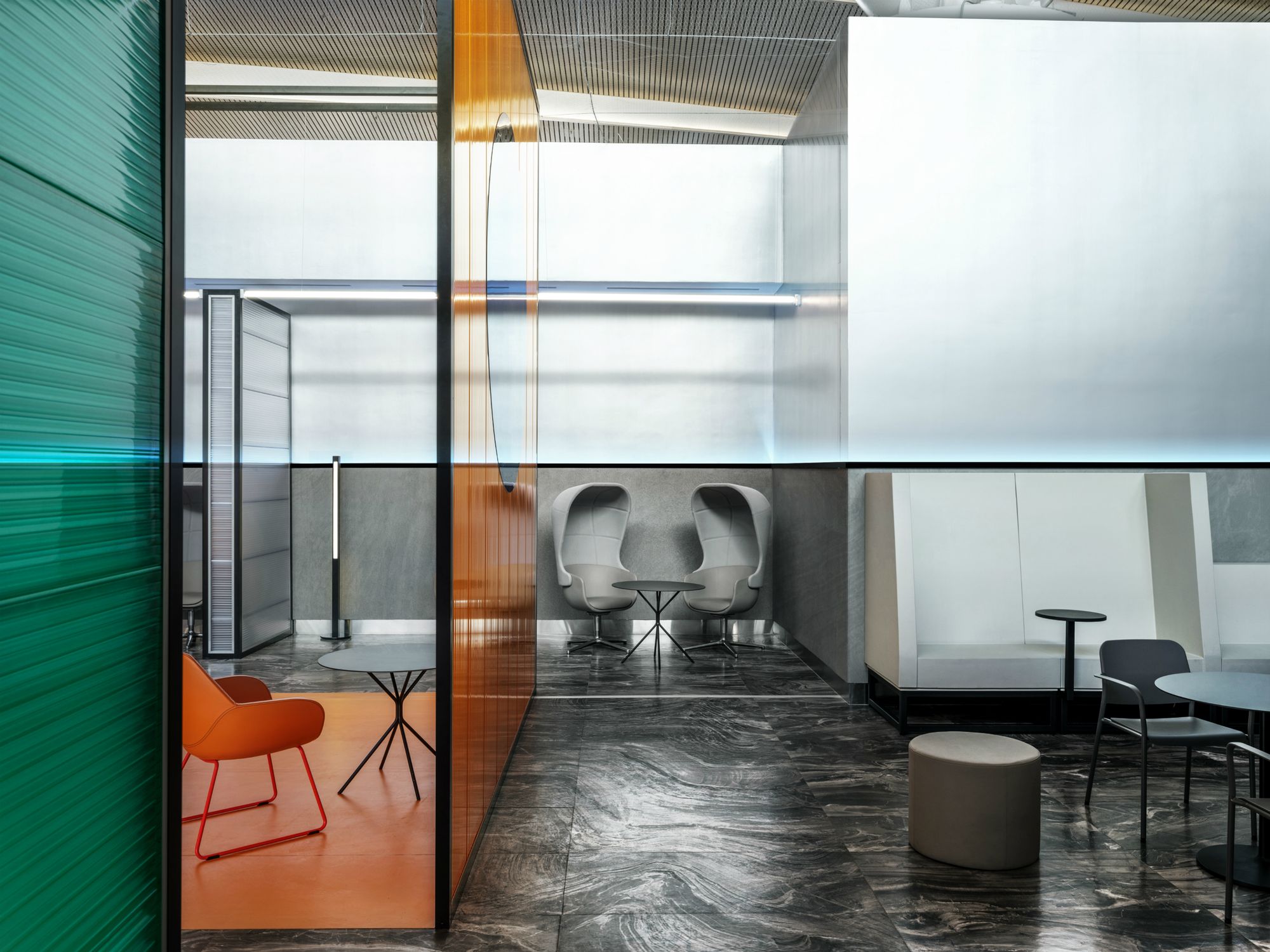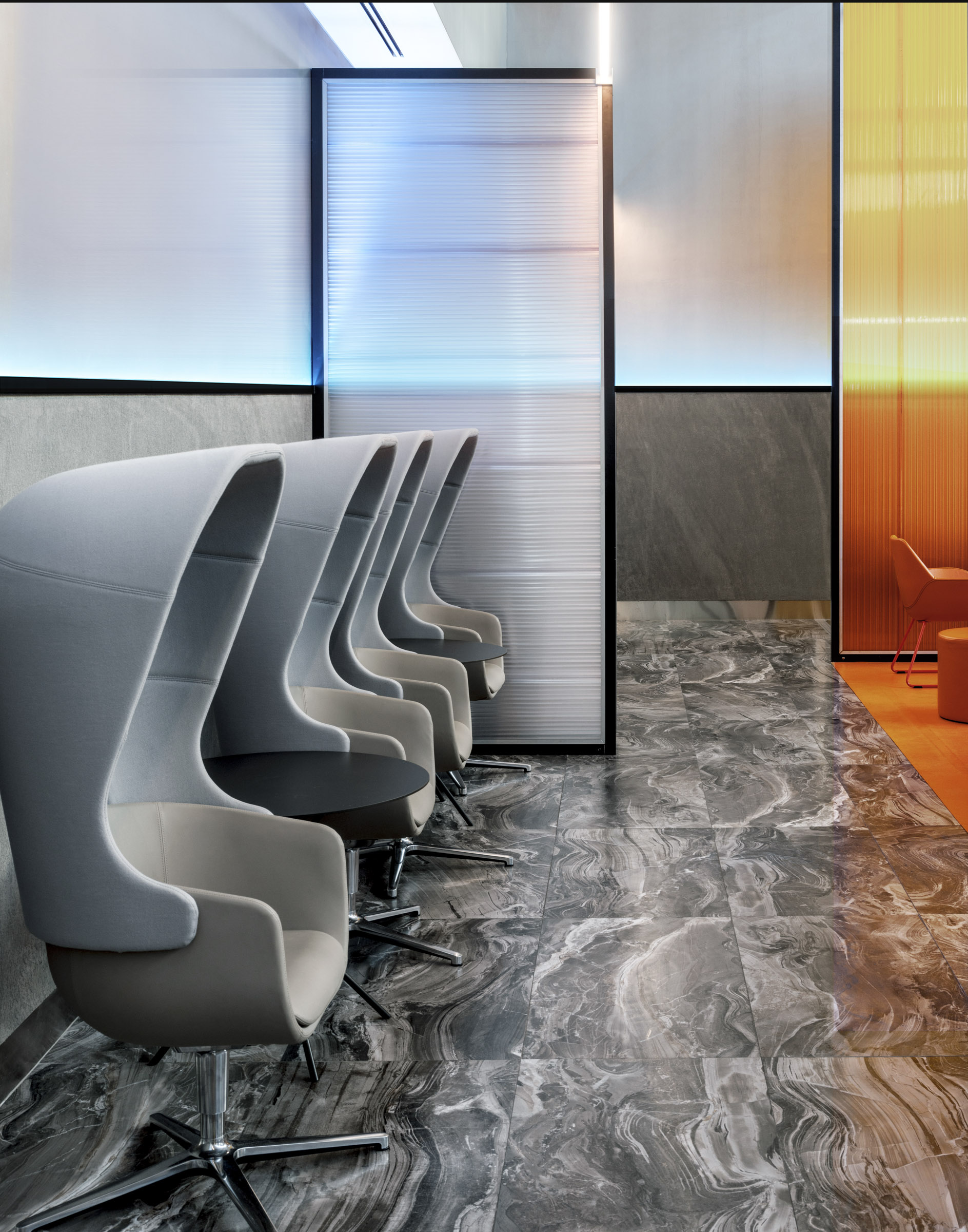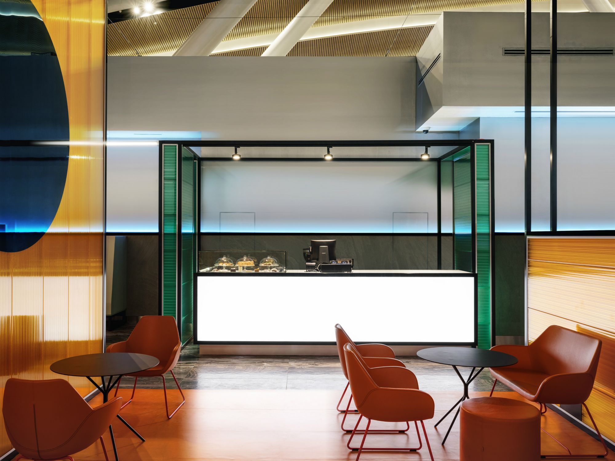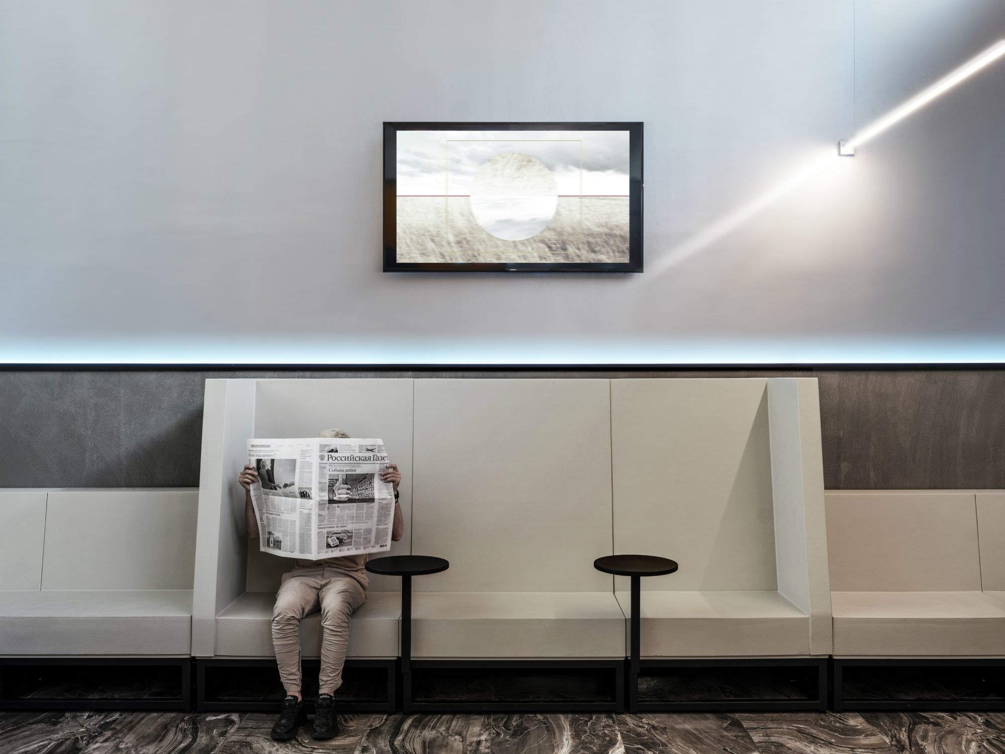 Бизнес-зал «Горизонт» является лауреатом профессиональной премии BEST PUBLIC SPACE Professional Design Award 2019 в номинации «Интерьер объектов транспортной инфраструктуры». Дизайн-проект основан на цветовой гамме трех стихий: солнца, неба и земли. В интерьере преобладают теплые янтарные, небесные серо-голубые и насыщенные зеленые оттенки сочной травы. Световые полосы реализованы с помощью герметичных светодиодных лент и алюминиевого профиля. Использование лент дневного белого свечения с высокой степенью пылевлагозащиты (IP67) обеспечивает надежность и долговечность проекта освещения.