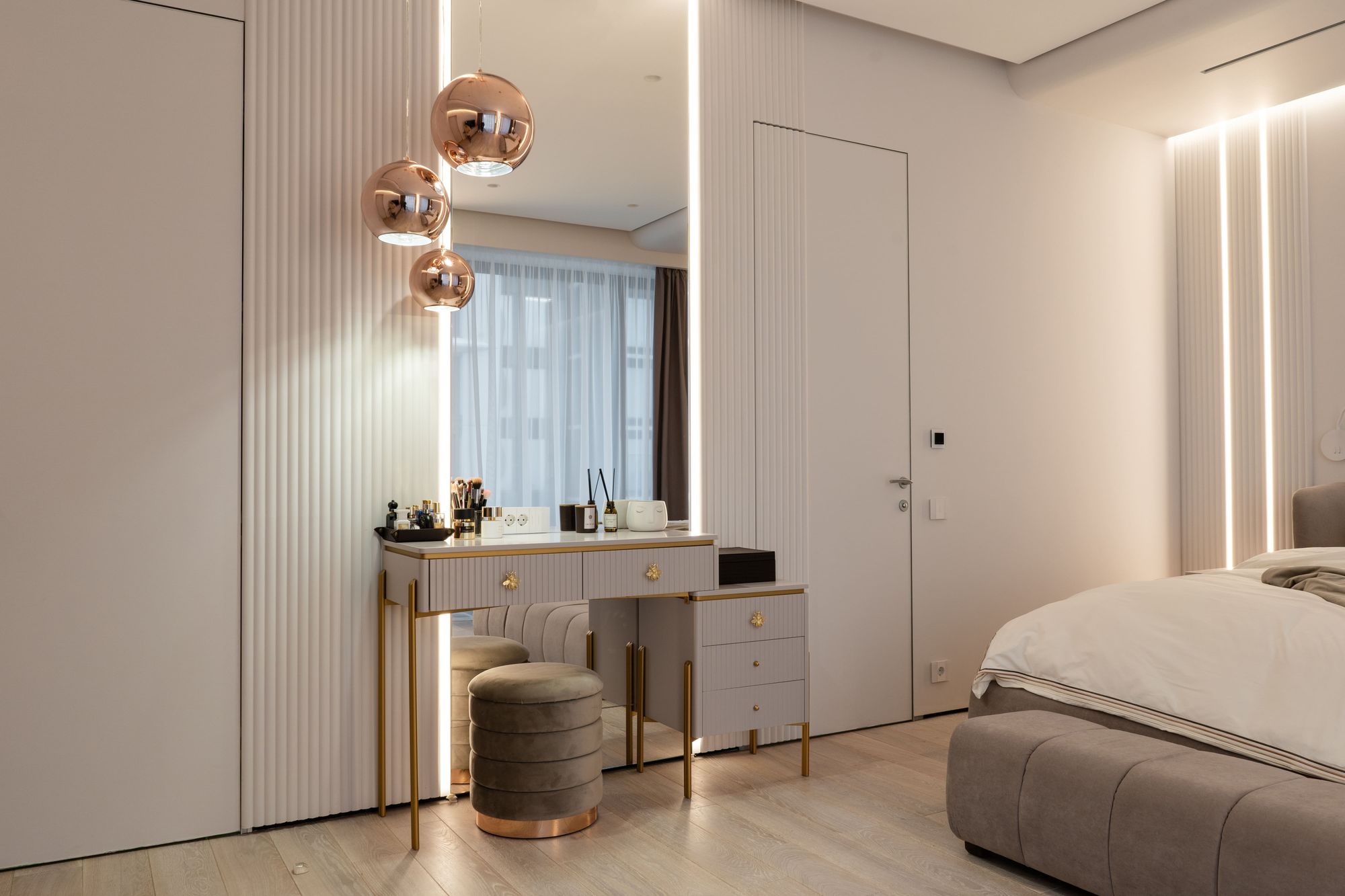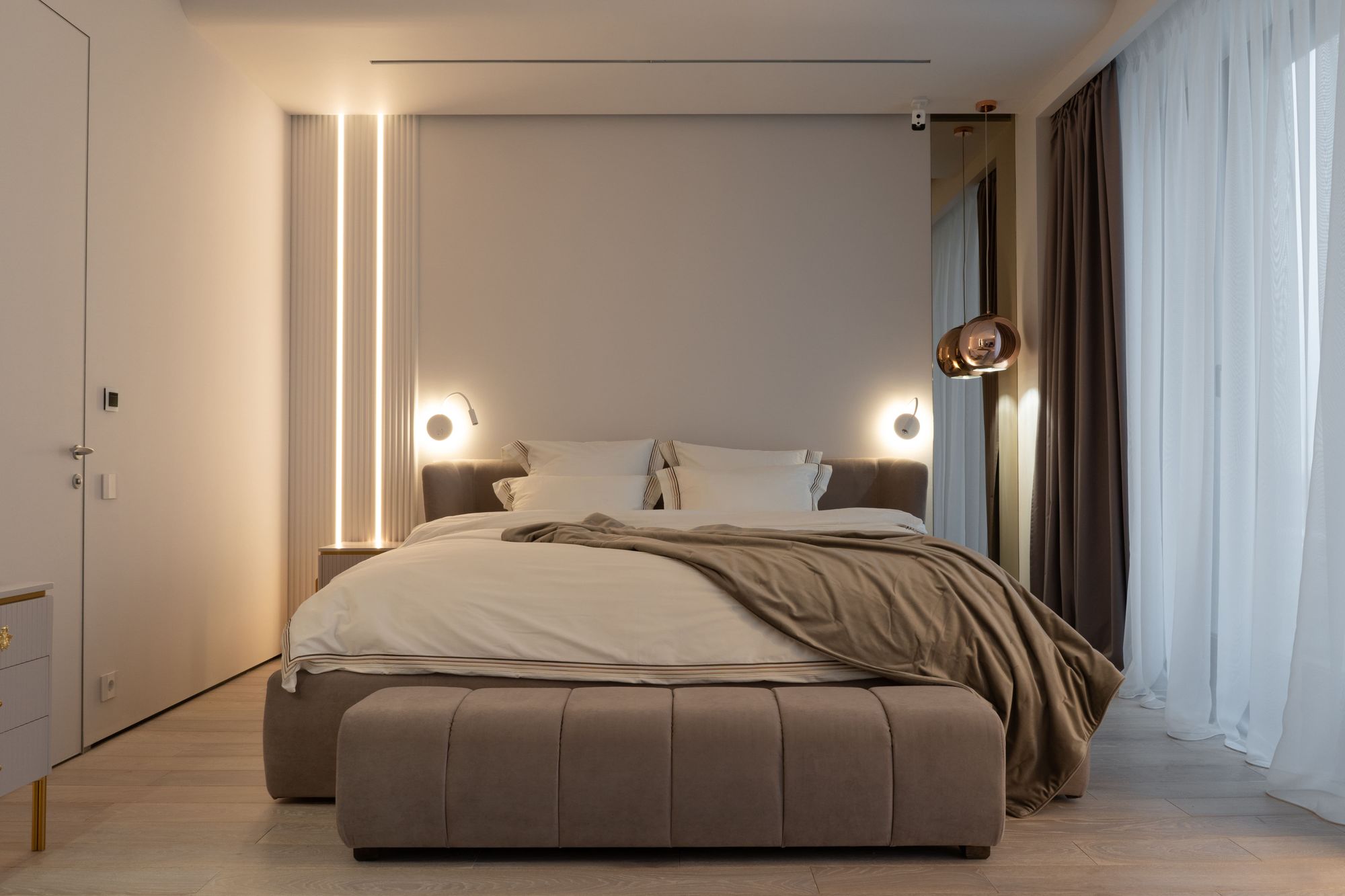 Линии света — один из основных источников декоративного и акцентного освещения. В светлой прихожей вертикальные световые линии эффектно подчеркивают зеркала, визуально еще больше придавая им высоту. В мастер-спальне особое управление подсветкой и линиями света позволяет включать и выключать отдельно каждый элемент, создавая в комнате подходящую атмосферу.