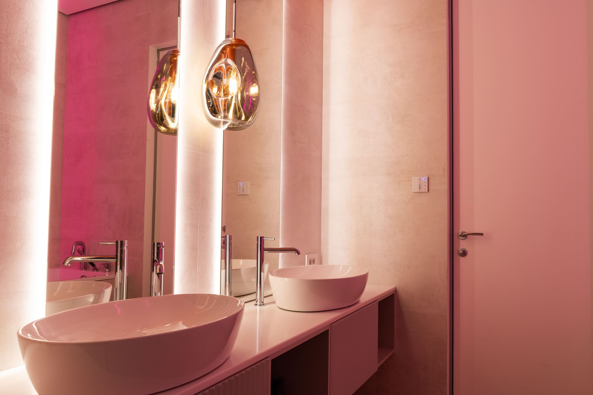 RGB-подсветка особенно актуальна в детских пространствах. В одной детской комнате лента RGB подсвечивает подиум со спальным местом, образуя красивый парящий эффект. В свою очередь магнитные трековые светильники обеспечивают локальное освещение. В другой детской — яркая RGB-подсветка интегрирована прямо в полки шкафа белого цвета, что настраивает на веселый и жизнерадостный лад. Особое место — детская ванная. Несмотря на то, что общий цвет — «взрослый» кремовый, оранжевая и голубая вставки на потолке, а также ярко-розовая подсветка в углу возле ванной делают ее привлекательной для детей.