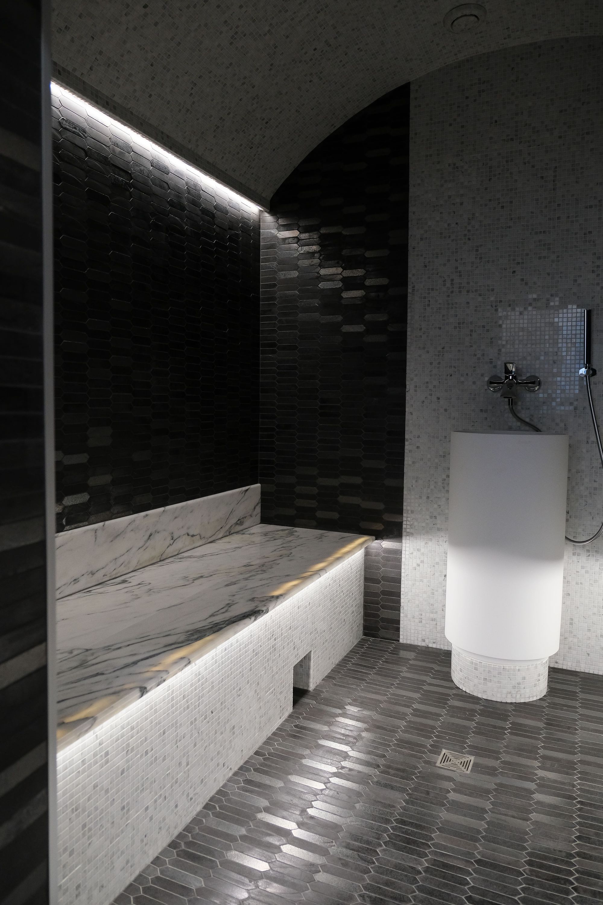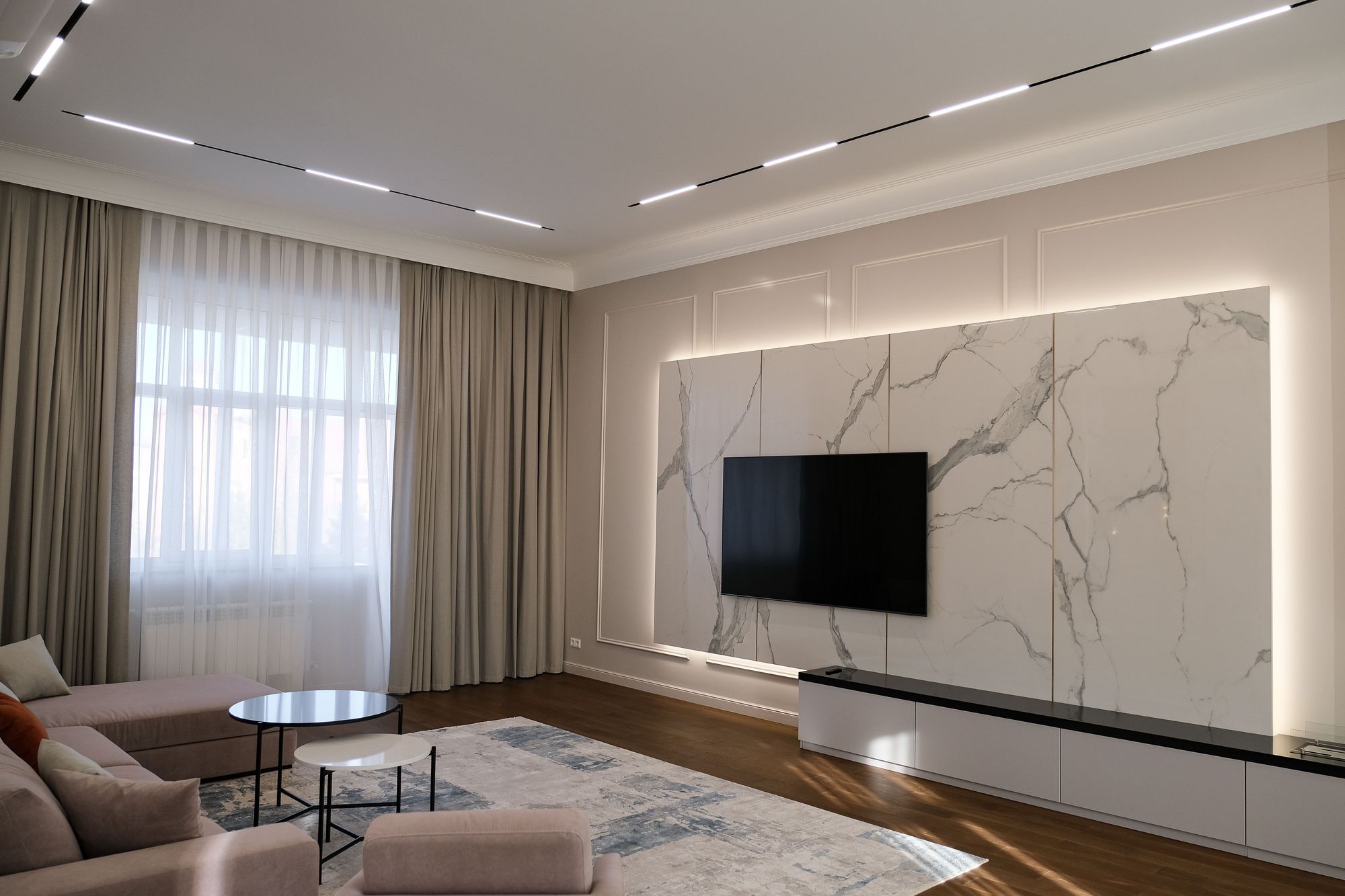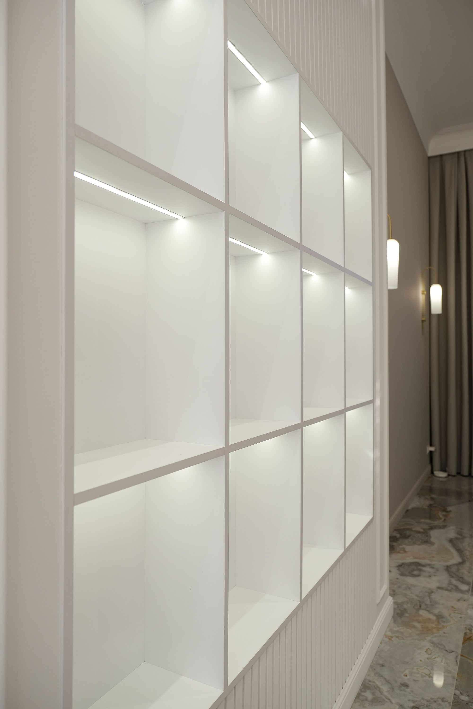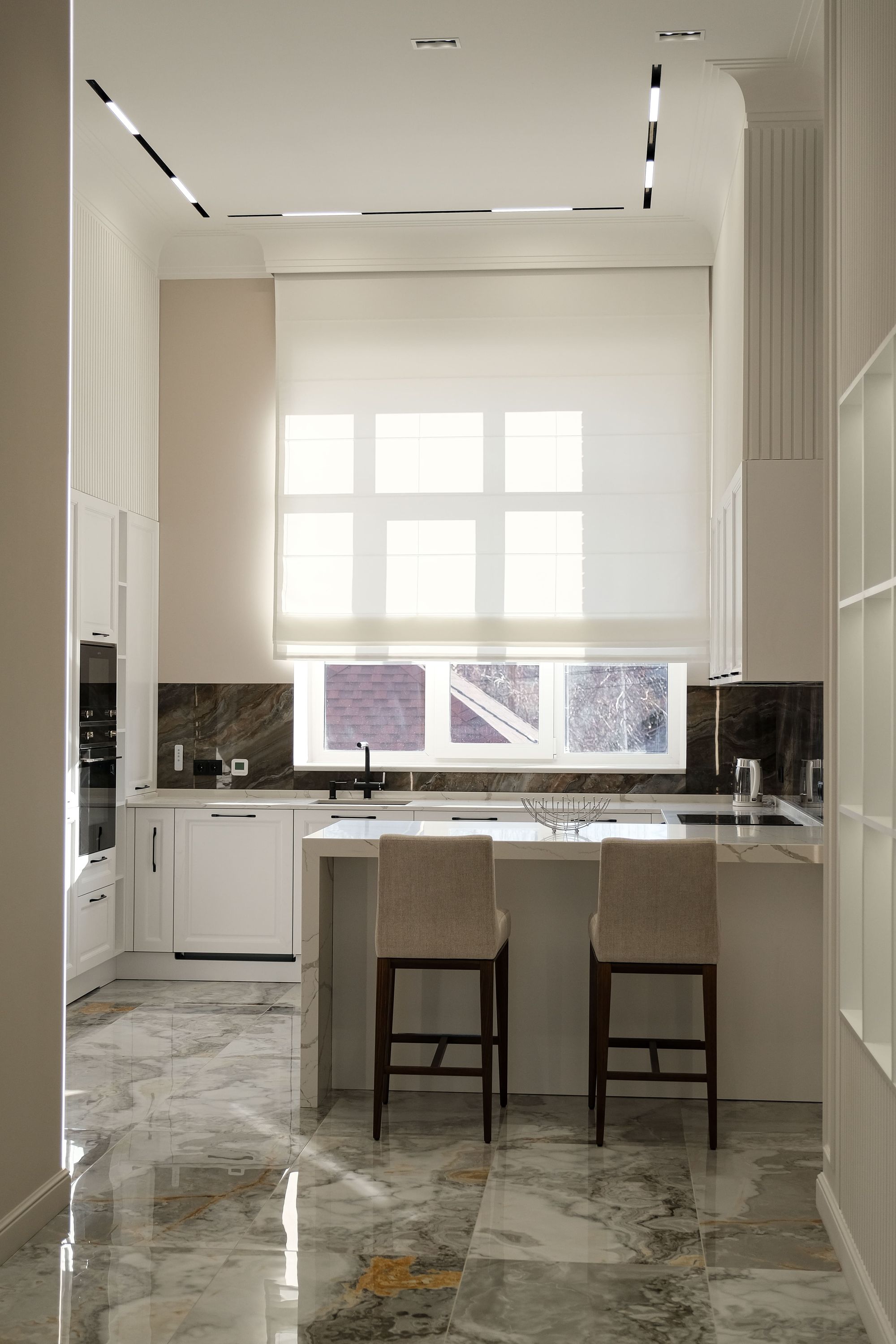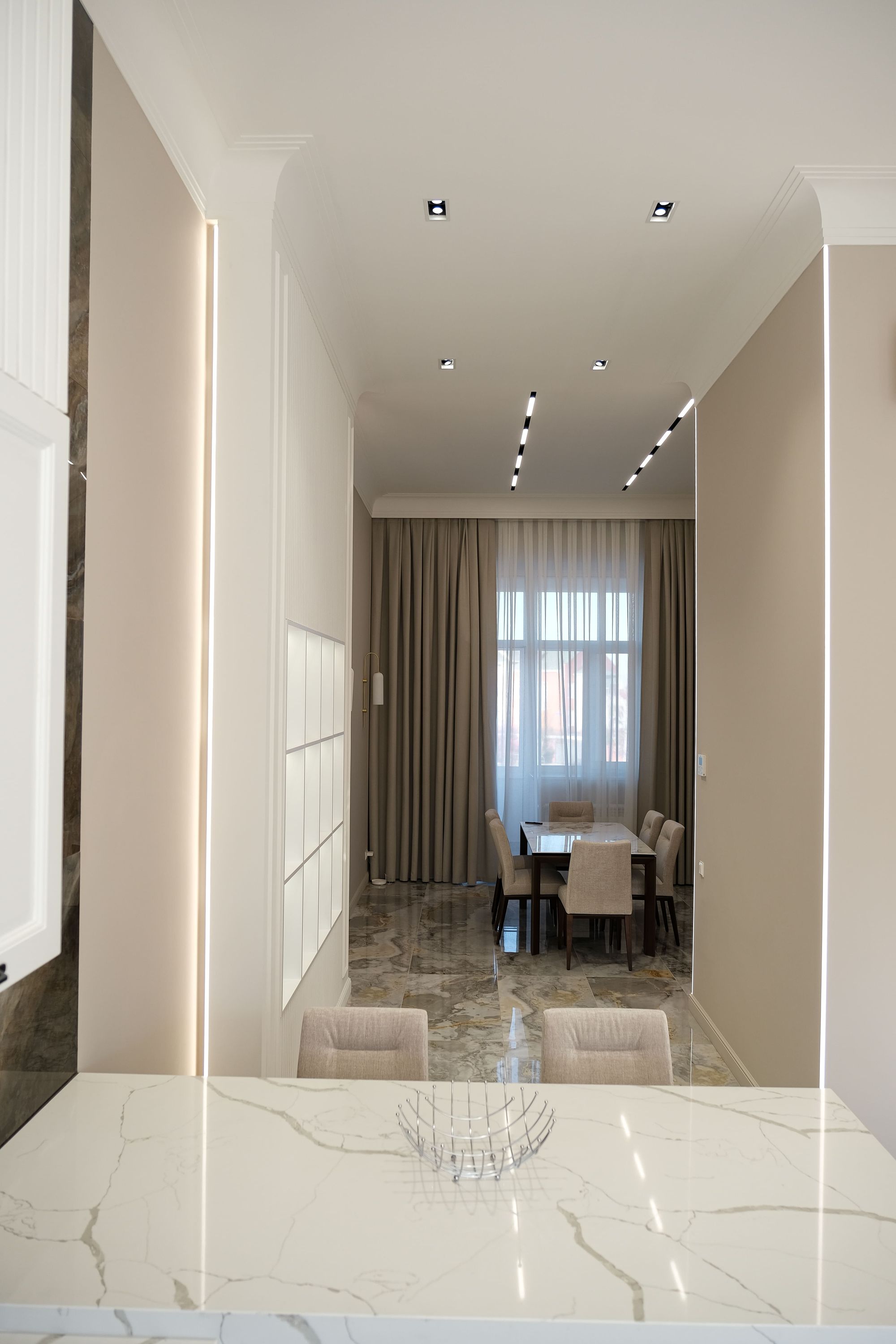 Встроенные треки с магнитными светильниками прямоугольной формы MAG FLAT смотрятся аккуратно и отлично подходят для создания основного и локального освещения. Благодаря рассеивателю на светильнике создается мягкий комфортный свет, который предотвращает блики на мраморной поверхности.