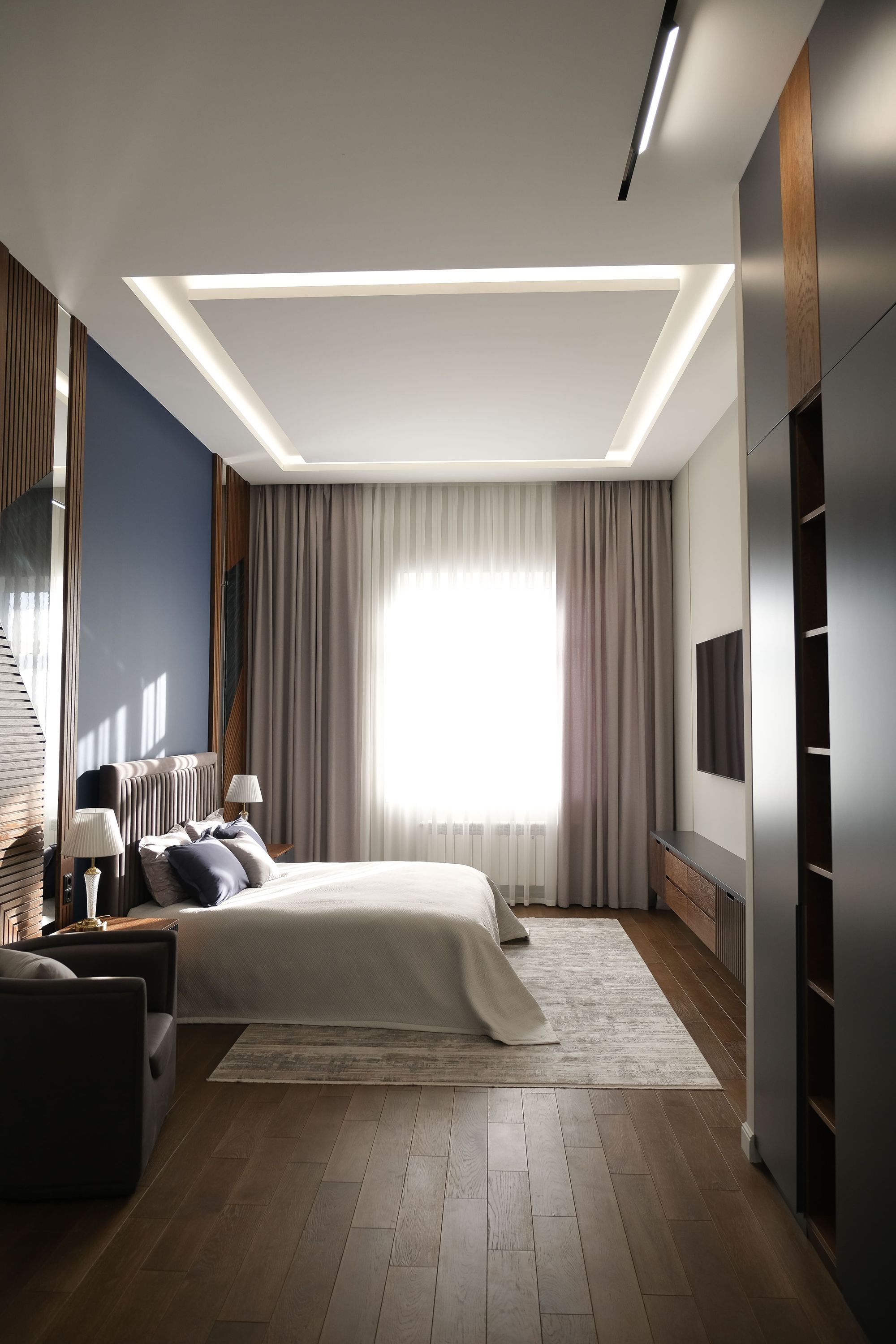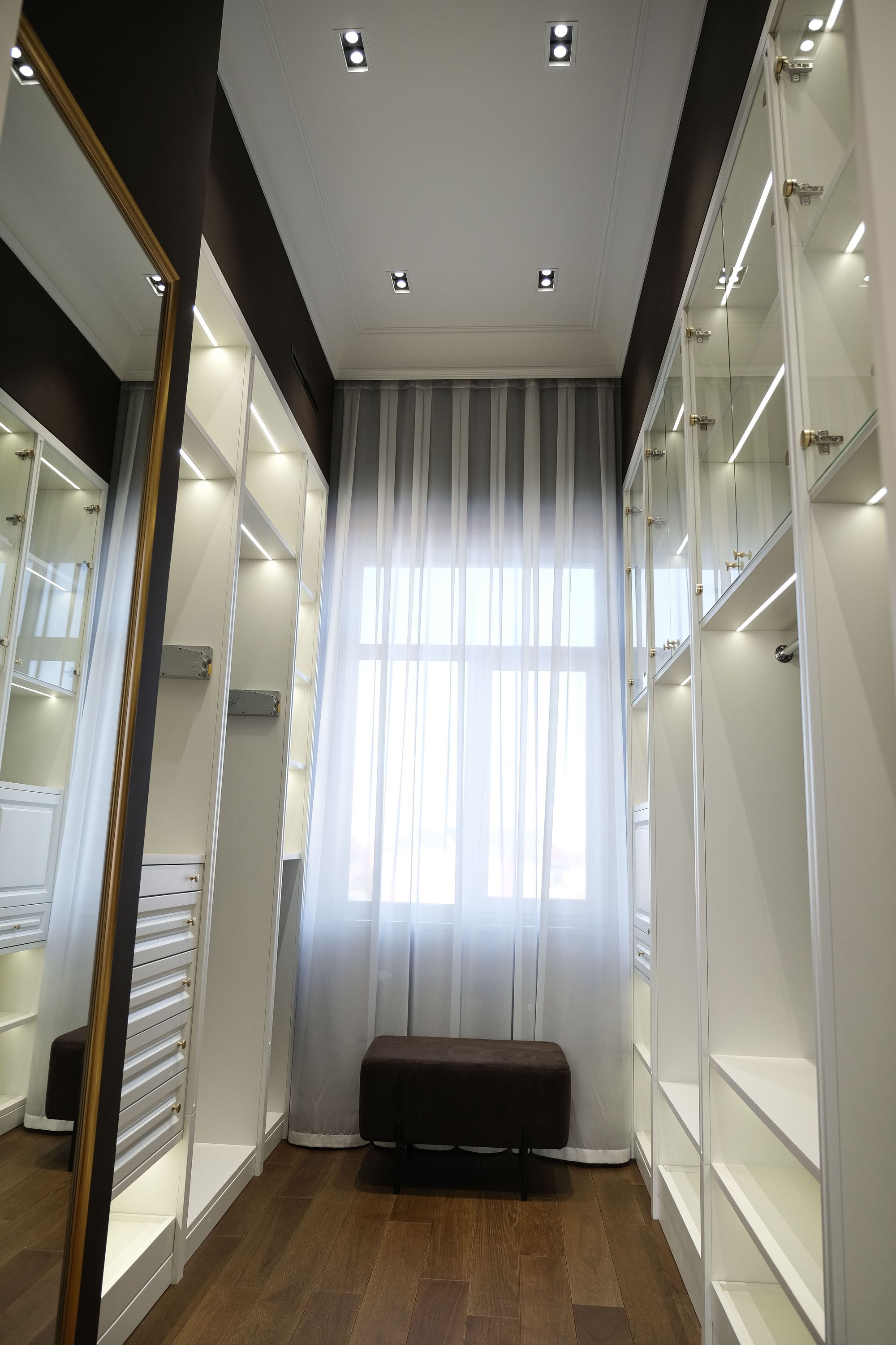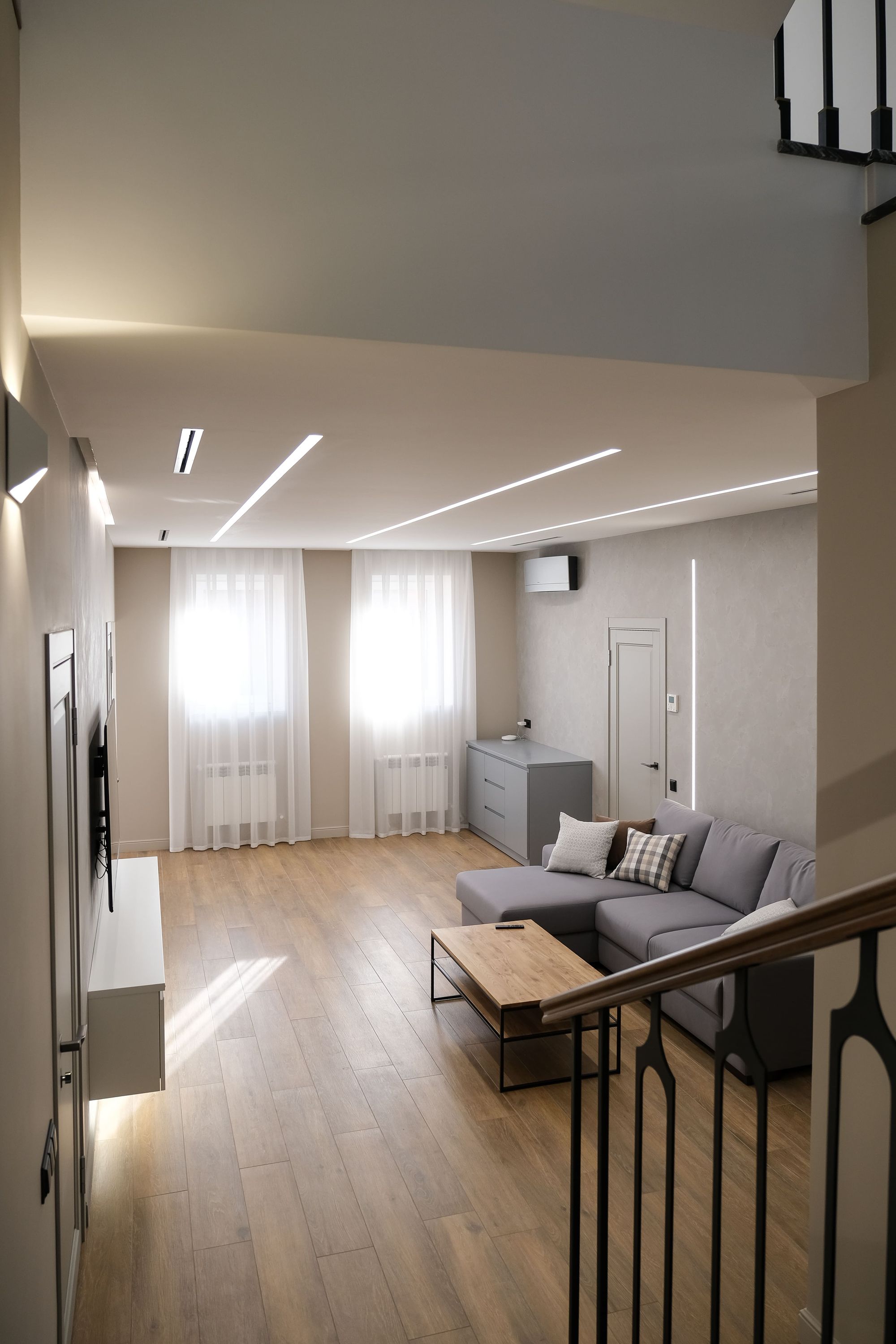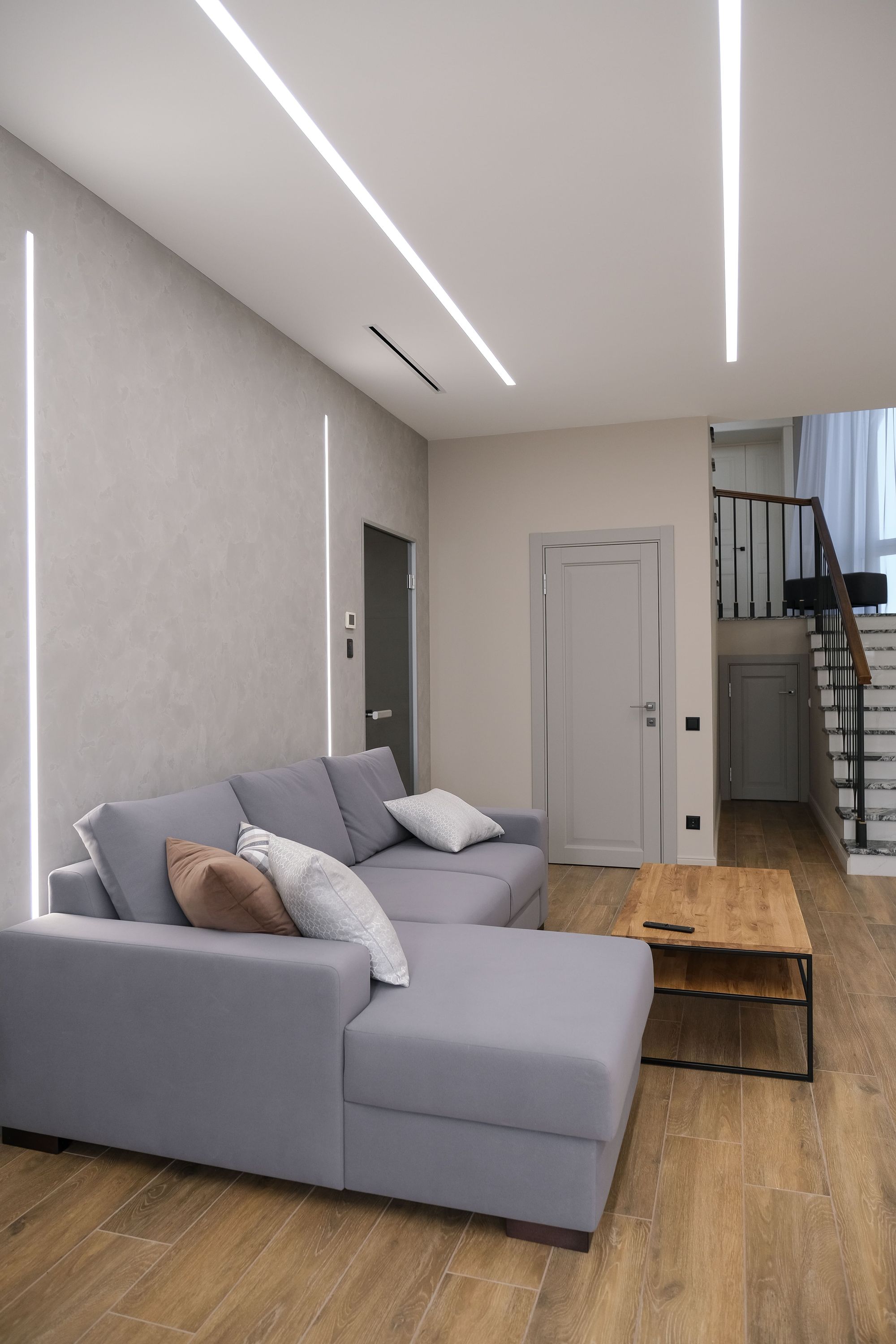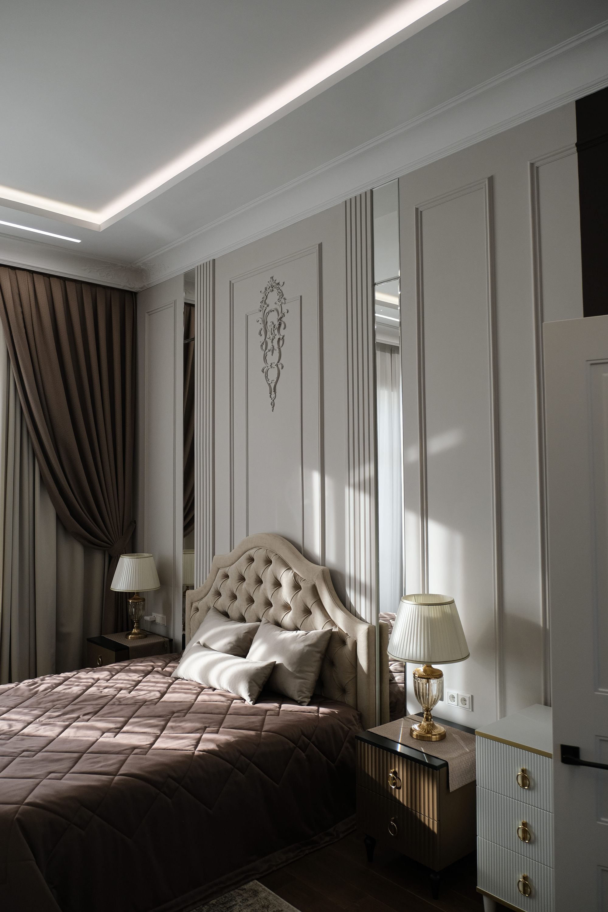 За исключением изящных декоративных люстр в одной из спален в классическом стиле и в ванной с элементами барокко, источники освещения по-современному лаконичны. Встроенные линии света и закарнизная подсветка применены практически во всех помещениях: они не только придают воздушности пространству и подчеркивают его геометрию, но и являются объединяющим элементом всех комнат в доме.
