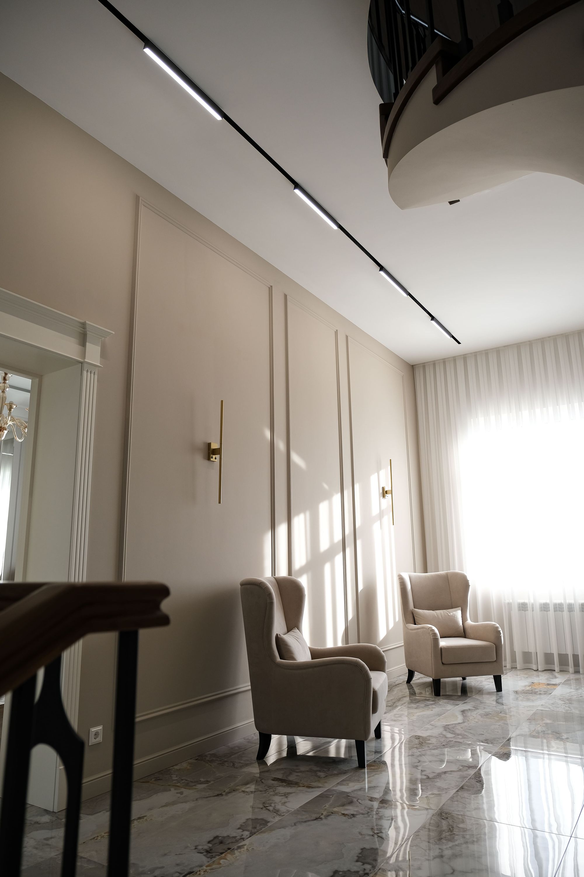 В интерьере частного коттеджа преобладает стиль неоклассицизм. Изящный молдинг, декоративные люстры, обилие мрамора и золотистые элементы фурнитуры грамотно интегрированы в пространство, благодаря чему в коттедже царит ощущение сдержанной роскоши. Однако интерьер остается современным и функциональным, что отчетливо прослеживается в подборе источников освещения.