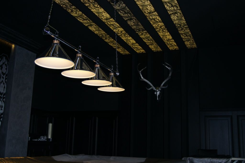 Оригинальность основного освещения достигнута благодаря использованию нестандартных, разнообразных люстр в виде рыбок, кораблей, колючих или, наоборот, мягких и плавных форм, неоспоримо привлекающих к себе внимание и являющихся акцентами в интерьере, в том числе, благодаря использованию в них светодиодной подсветки.