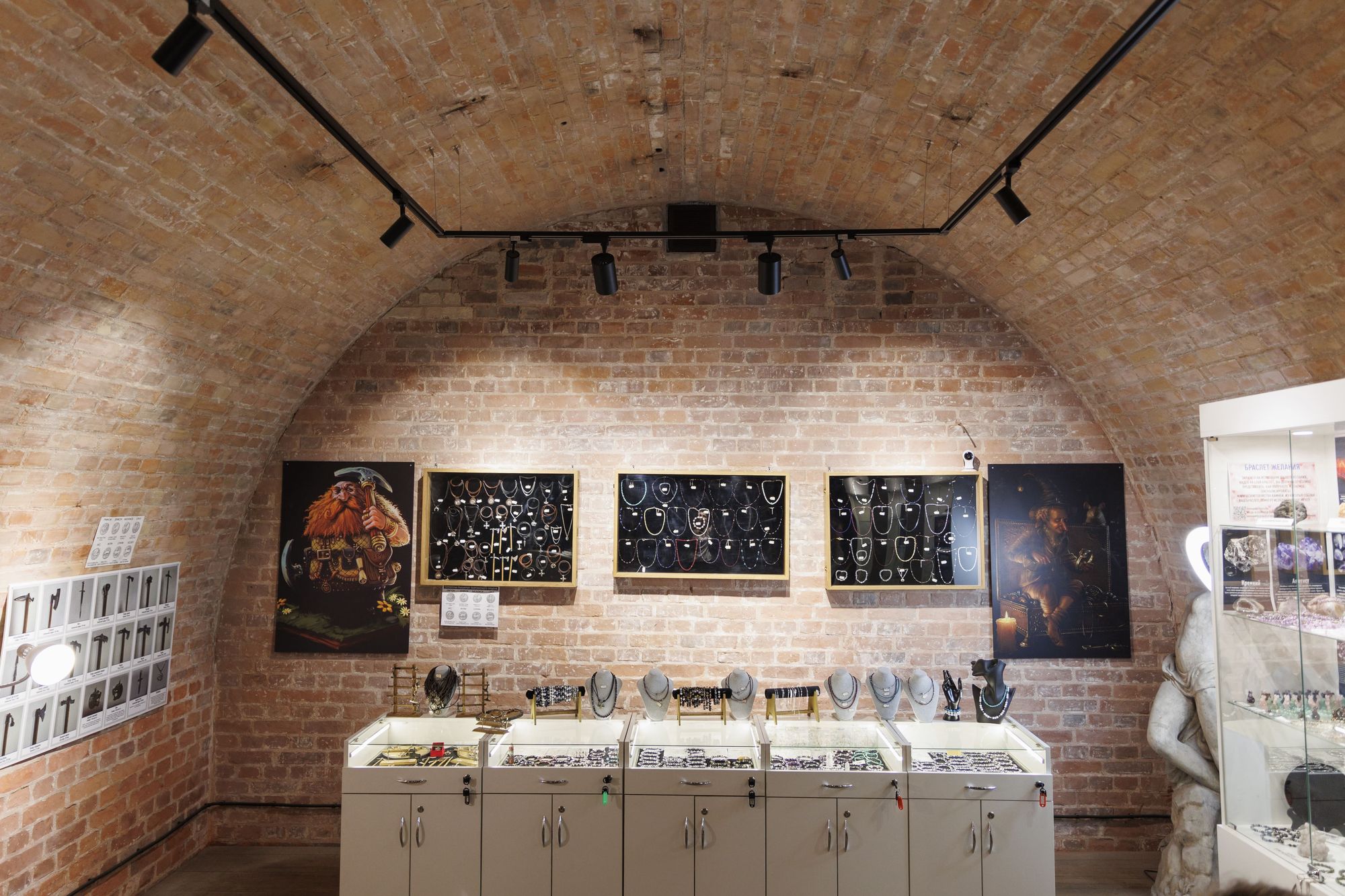 Освещение всего пространства музея выполнено в едином стиле. Черные треки серии LGD гармонично сочетаются с металлическими решетками, словно становясь их продолжением. Конструкции из треков установлены на подвесах, что является отличным решением в помещениях со сводчатым потолком.