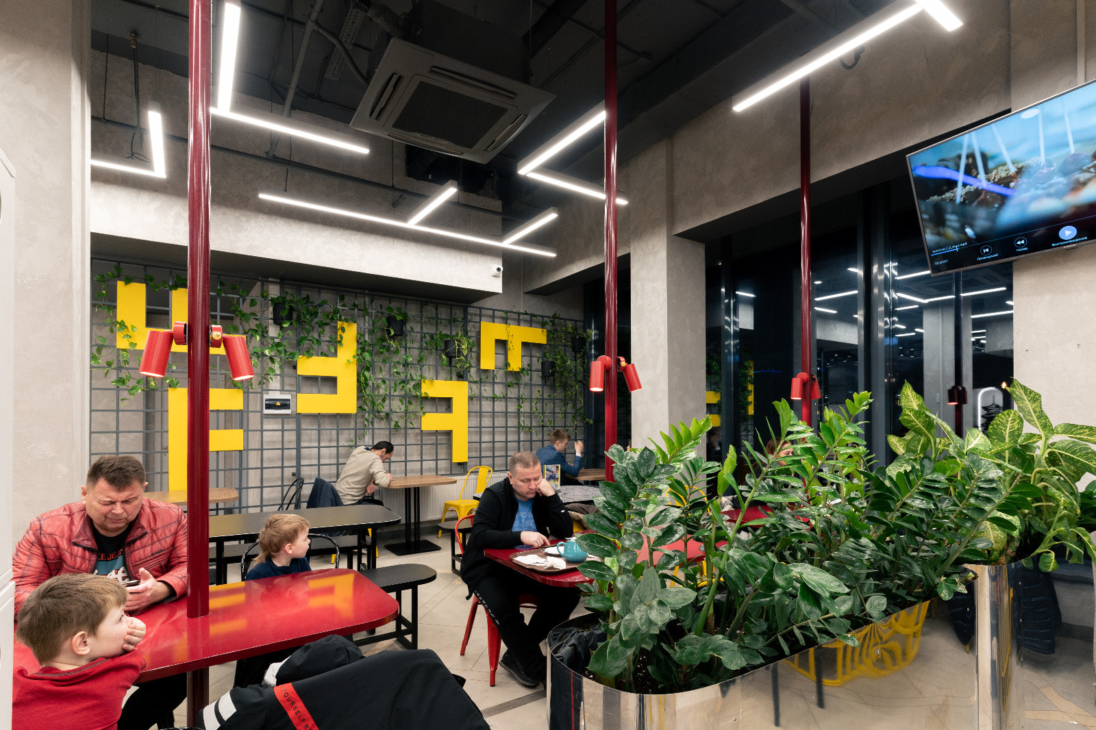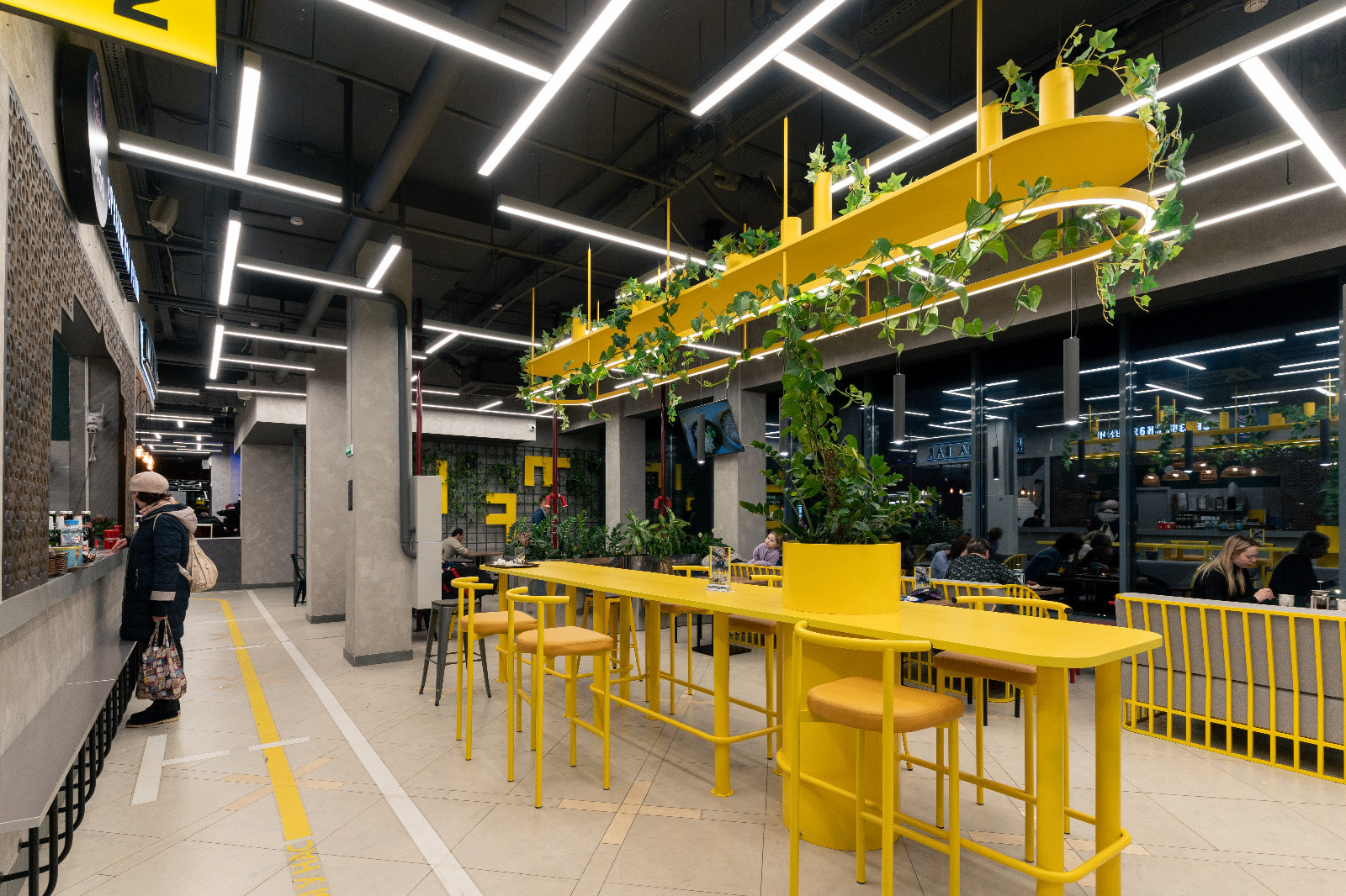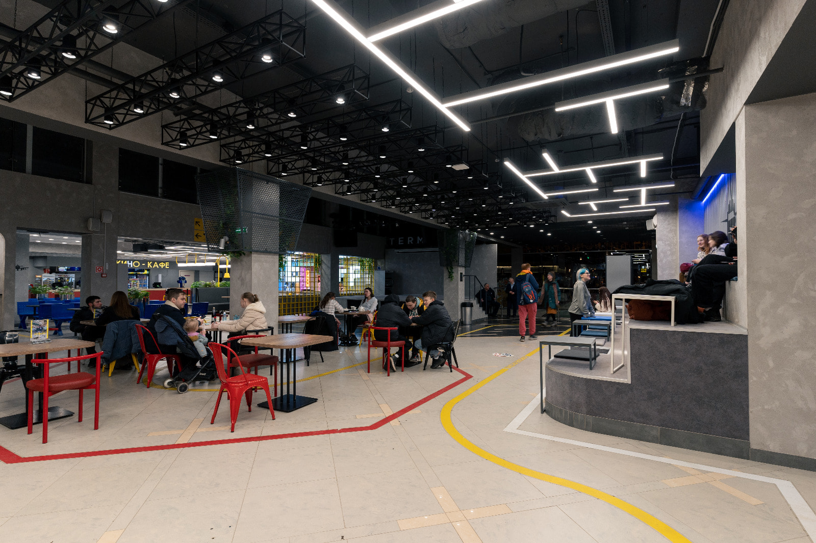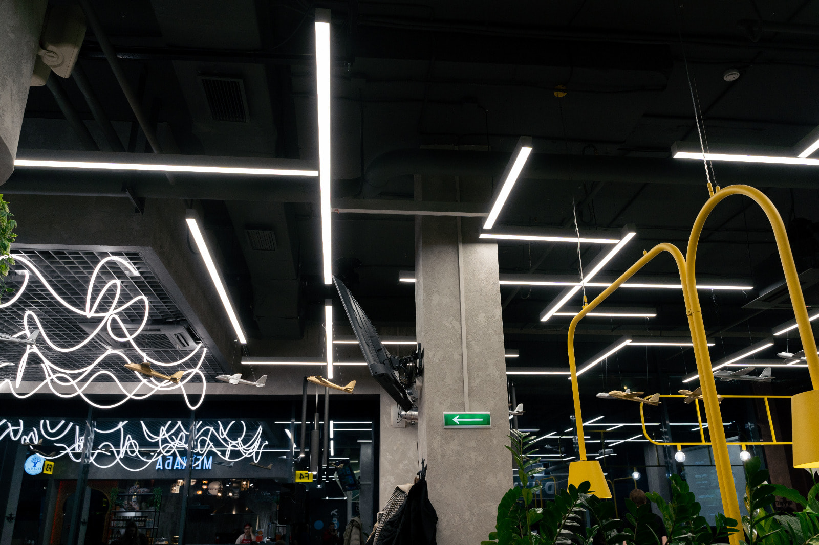 Основное освещение фудкорта выполнено в дневном белом цвете (4000 К): свечение с такой цветовой температурой отличается умеренной строгостью и помогает сконцентрироваться, благодаря чему его часто используют в аэропортах. Помимо подвесных линейных светильников, для освещения зала был применен гибкий неон: волнообразные линии света, парящие в воздухе и похожие на облака, и кружащиеся среди них небольшие самолетики создают эффектную и трогательную композицию.