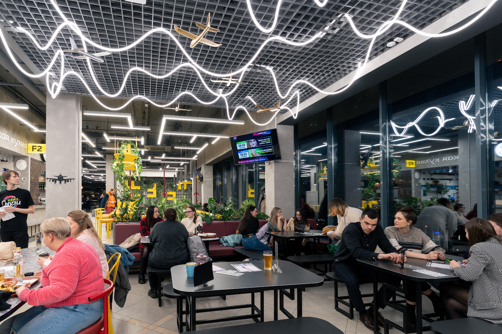 Многие пространства фудкорта идеально подходят в качестве эффектных фотозон. К примеру, зона, огороженная желтой ширмой, привлекает гостей торгового центра не только уютным расположением и креслами, стилизованными под тележки для багажа, но и стильной неоновой надписью. Еще одна оригинальная локация — двухуровневый подиум, позади которого размещено монохромное изображение самолета, подсвеченное лентой с синим свечением.