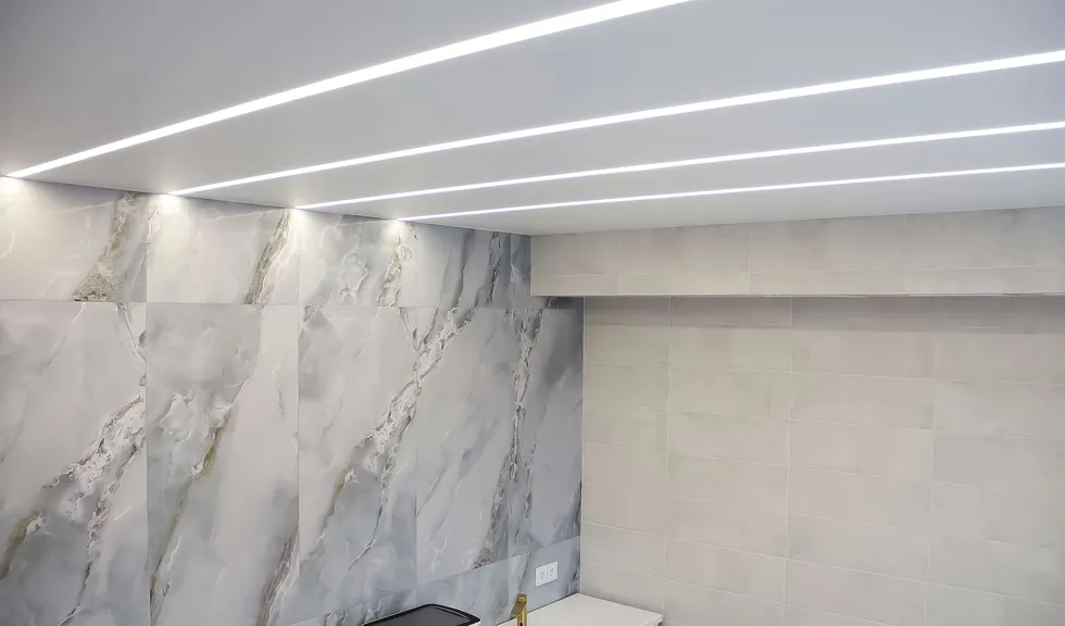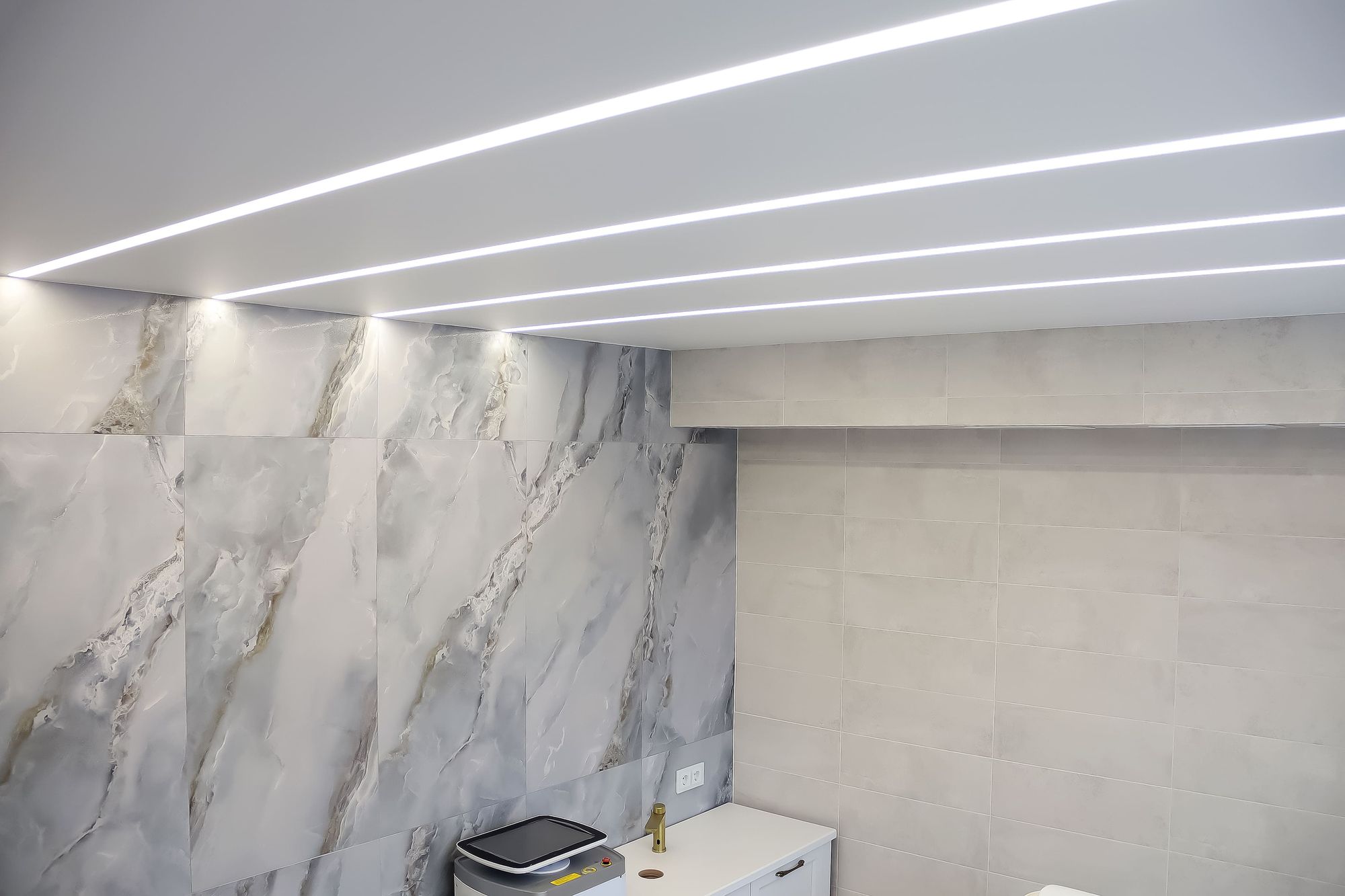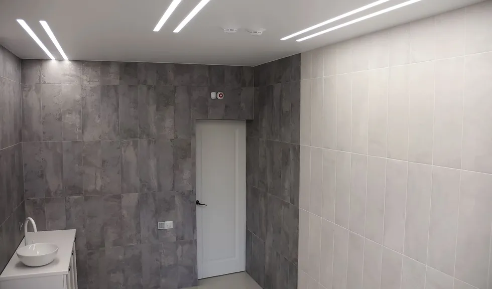 Минималистичный стиль интерьера отражен в освещении: компактные, энергоэффективные светильники обеспечивают комфорт для работы персонала. Основное решение — линейные модели на основе LED-лент и алюминиевых профилей. Такие профильные светильники создают равномерное освещение, сохраняя легкость пространства. В технических зонах и входных группах также соблюден единый стиль.