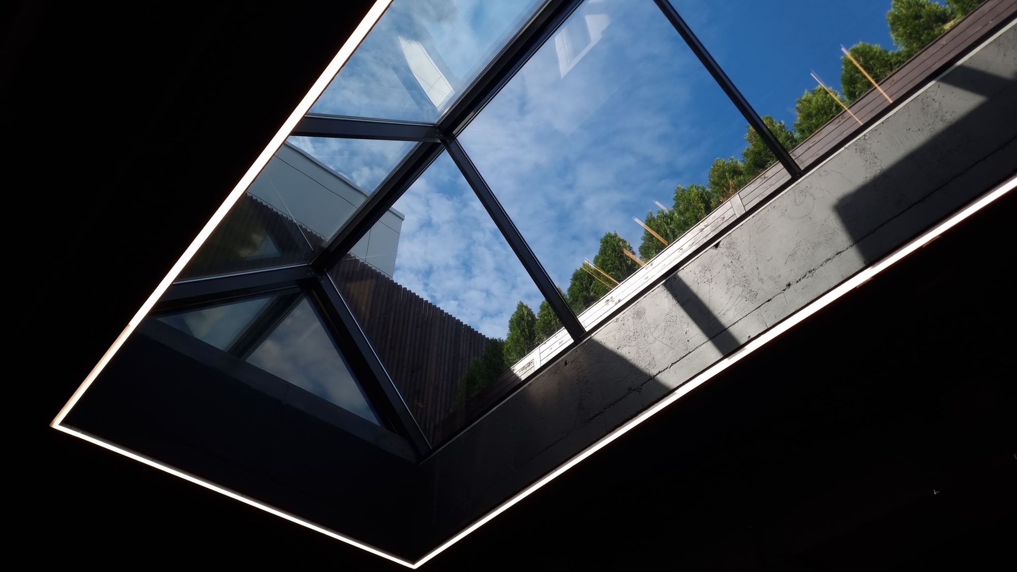 Зона автомойки просторна и функциональна. Световые порталы локально освещают каждую ячейку для мытья машин, а также погружают посетителей в атмосферу фильмов про автогонки и красивые машины. Свечение белого цвета контрастно смотрится на фоне темно-серого интерьера. При этом обстановка эмоционально не давит на посетителей благодаря пирамидальному участку крыши из стекла, через который проходит естественный свет.