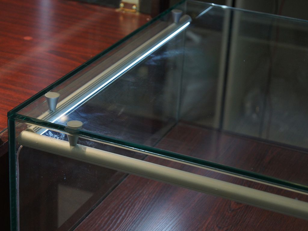 Подсветка другой витрины так же выполнена с использованием алюминиевого профиля, для этого выбрали модель круглой формы. Профиль установили на верхнее стекло витрины при помощи специальных держателей. Он был установлен под углом и закрыт матовым светопропускающим экраном, поэтому свет направлен именно на выставляемую продукцию и при этом не "бьёт" по глазам.