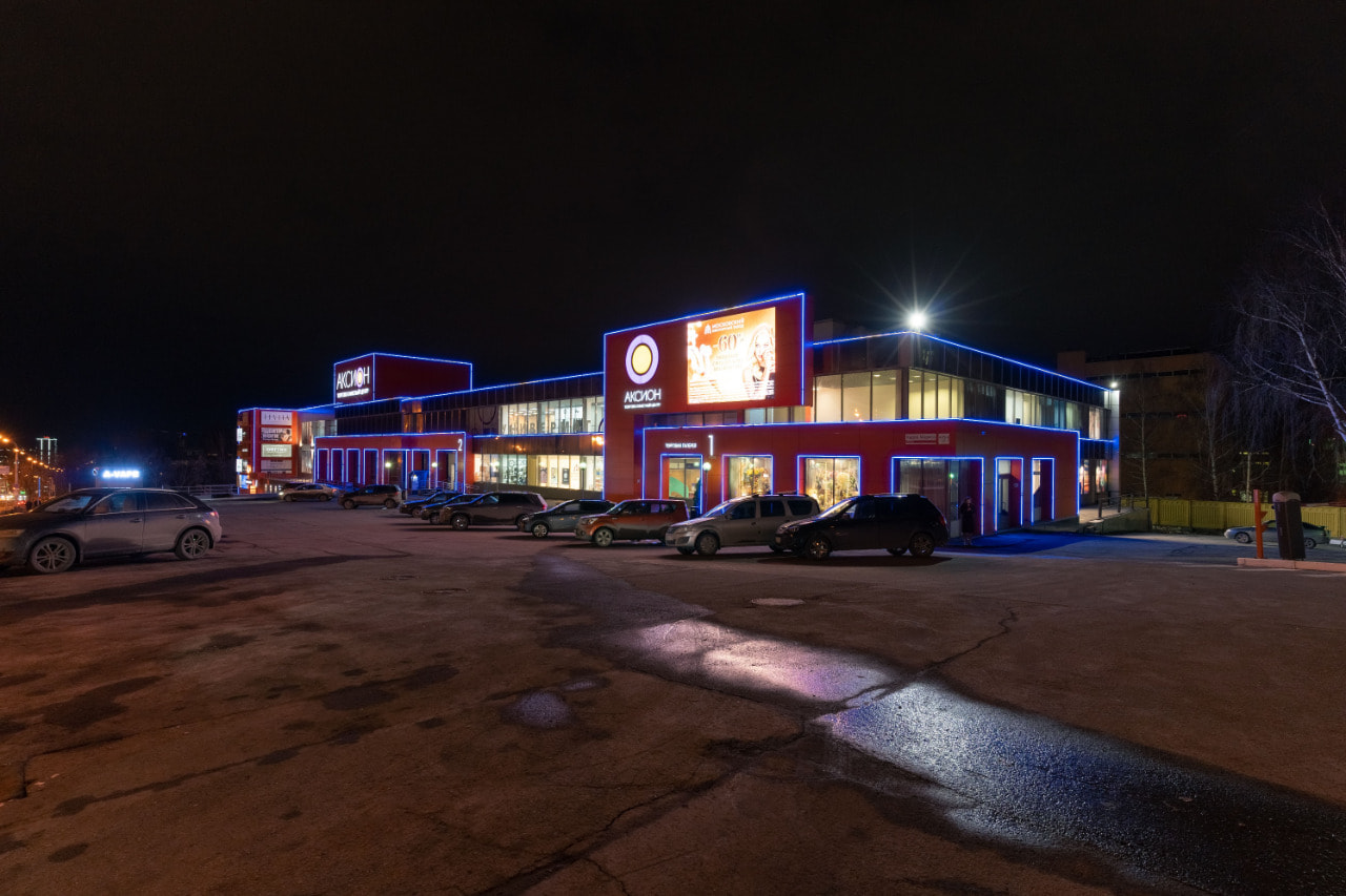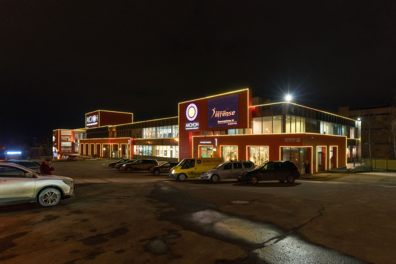 Подсветка торгового центра «Аксион» выполнена на основе RGB-ленты с высокой степенью пылевлагозащиты (IP67). Благодаря поддержке управления по протоколу SPI лента воспроизводит различные динамические сценарии, которые оживляют внешний вид торгового центра. Световой контур очерчивает не только границы здания, но и витрины и входные проемы на первом этаже, что создает лучшую освещенность.