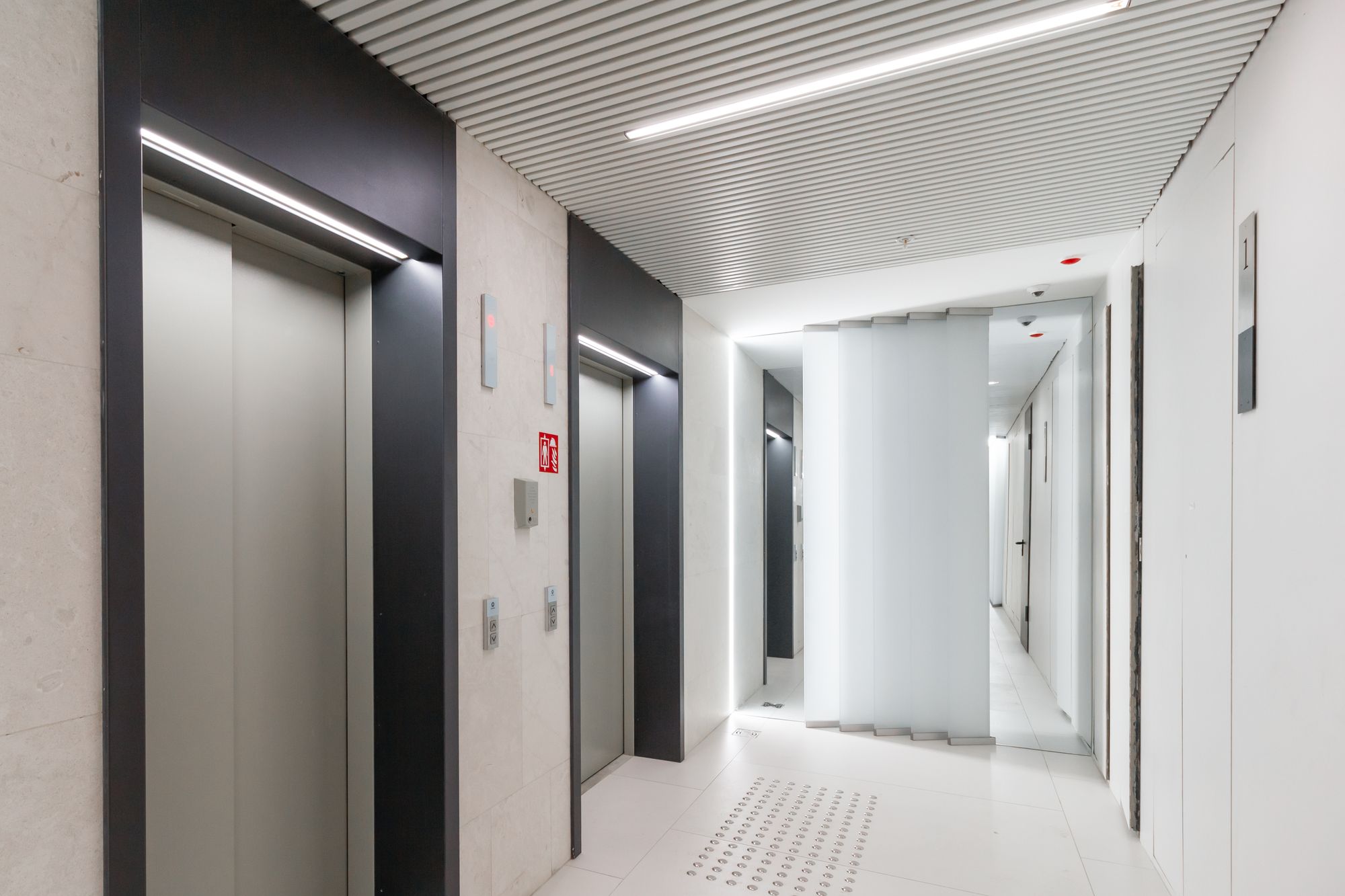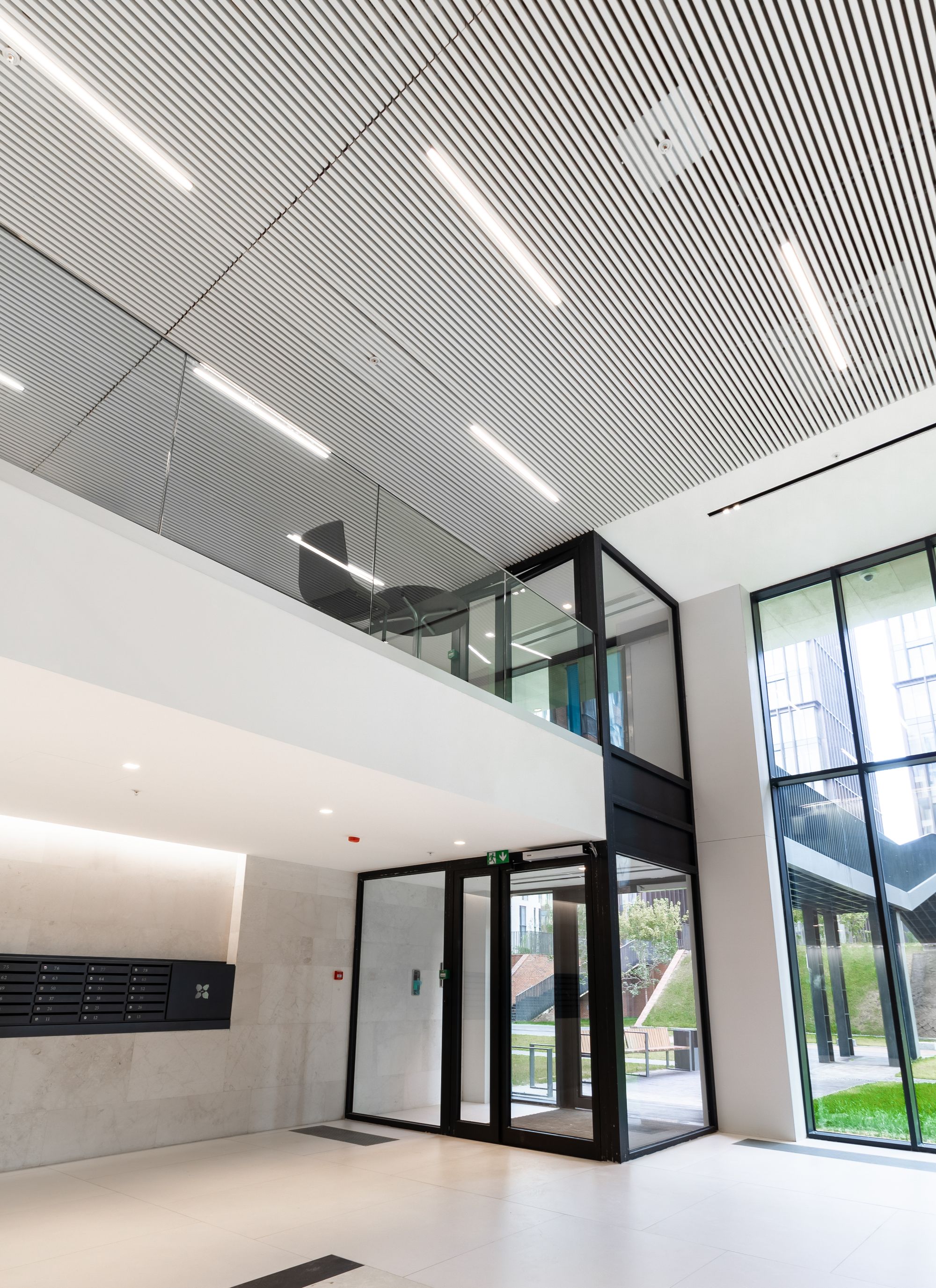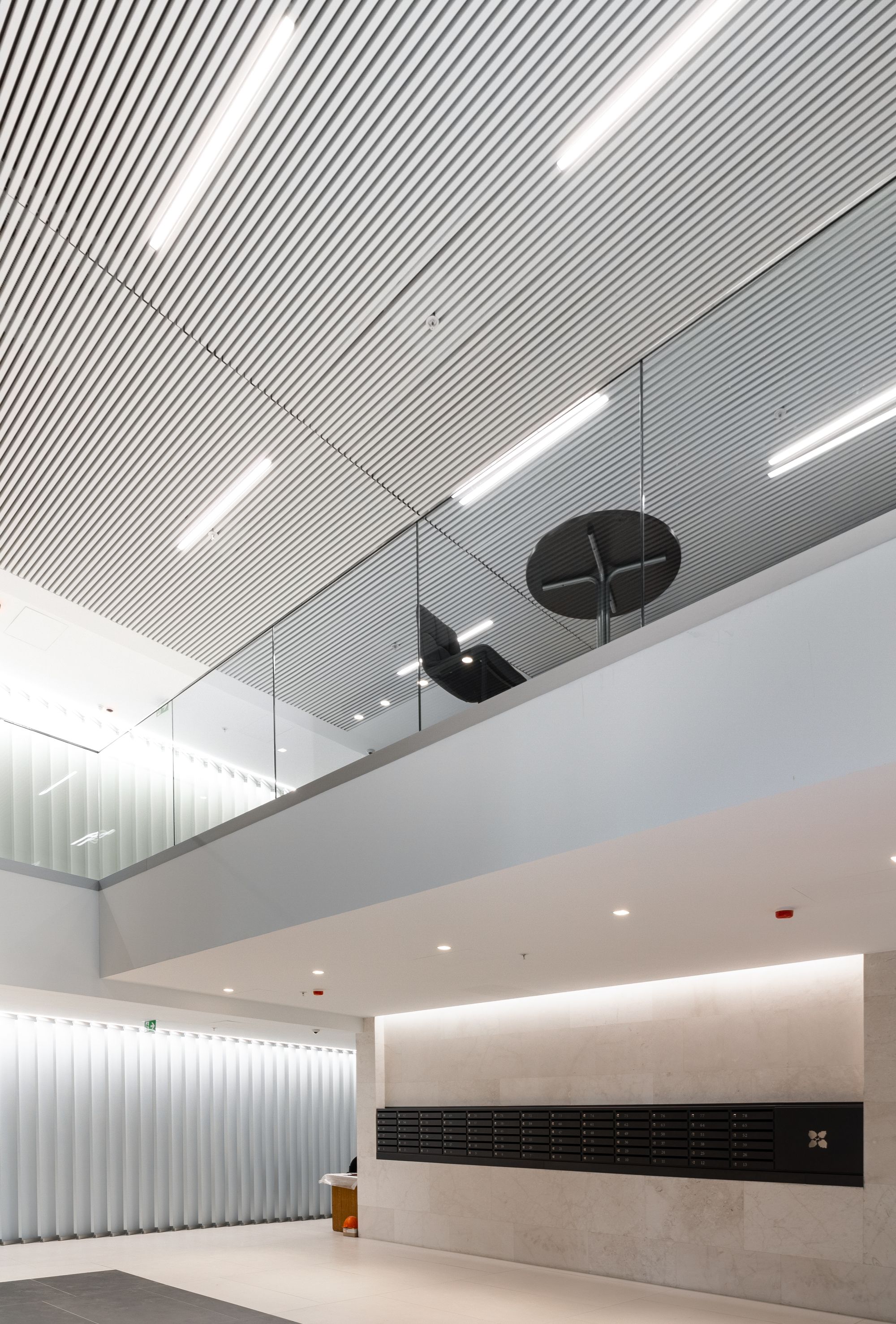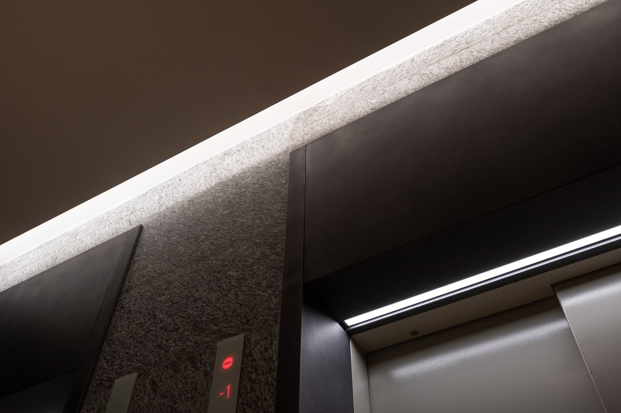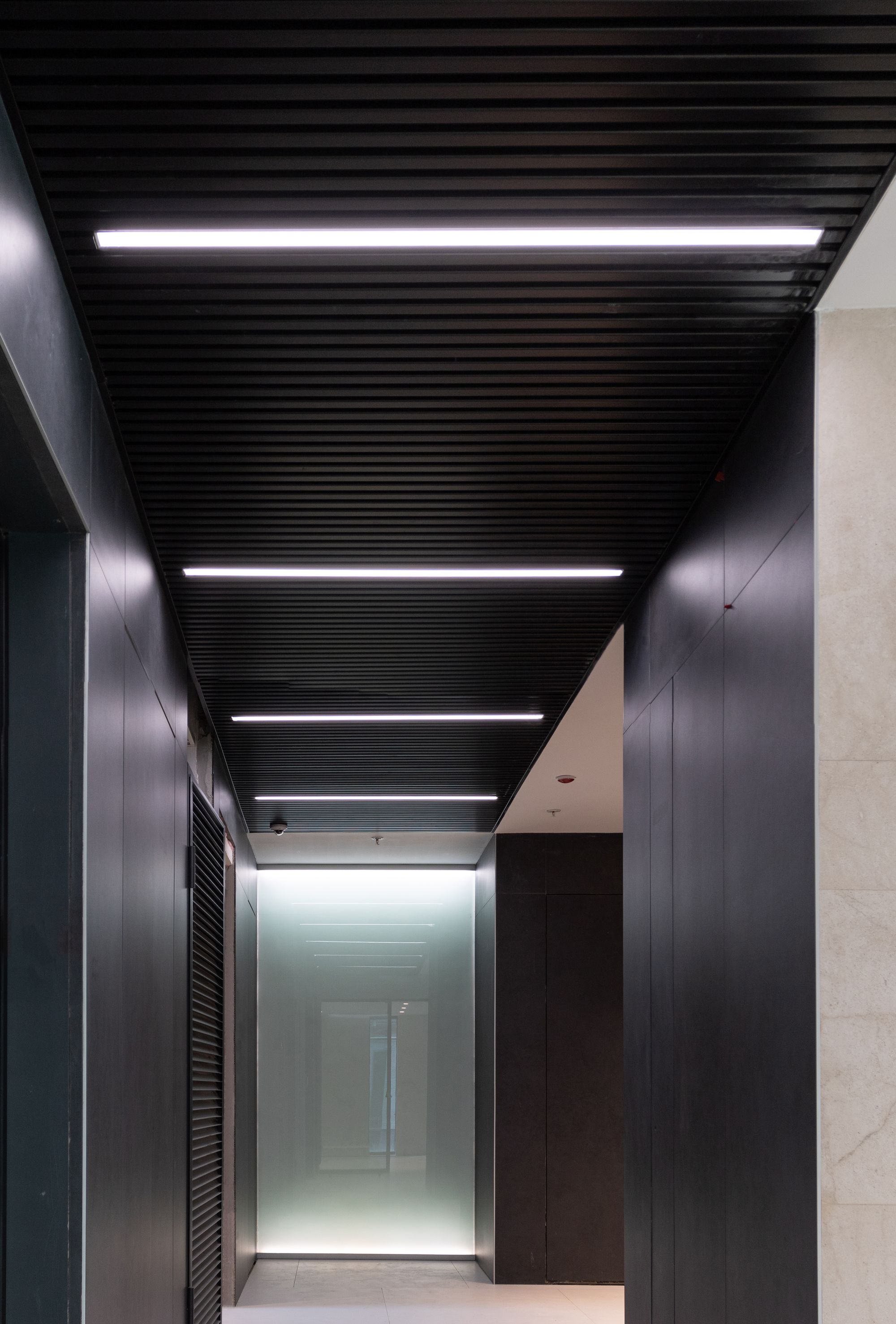 Простые и эстетичные линейные светильники идеально смотрятся в коридорных и лифтовых зонах с лаконичным дизайном. Использование линейных светильников разных размеров подчеркивает индивидуальность пространства и создает качественное освещение. Черные подвесные светильники добавляют светлым стенам и потолку контраста. Анодированные профили со светодиодными лентами интегрированы в стены и похожи на естественное солнечное освещение, проникающее внутрь здания через приоткрытую дверь. Ленты дневного и теплого белого свечения создают атмосферу солнечного дня внутри жилого комплекса в любое время суток. Светодиодные ленты и светильники применяются для основного и декоративного освещения во всех общественных зонах здания.