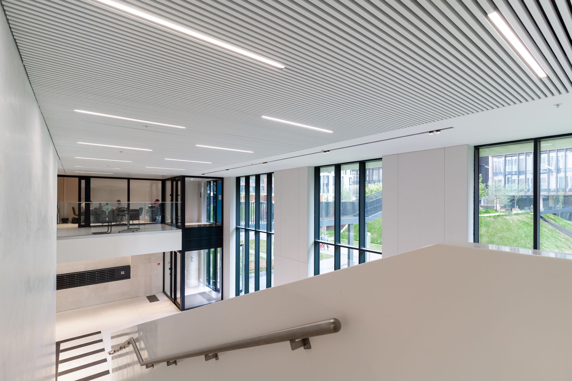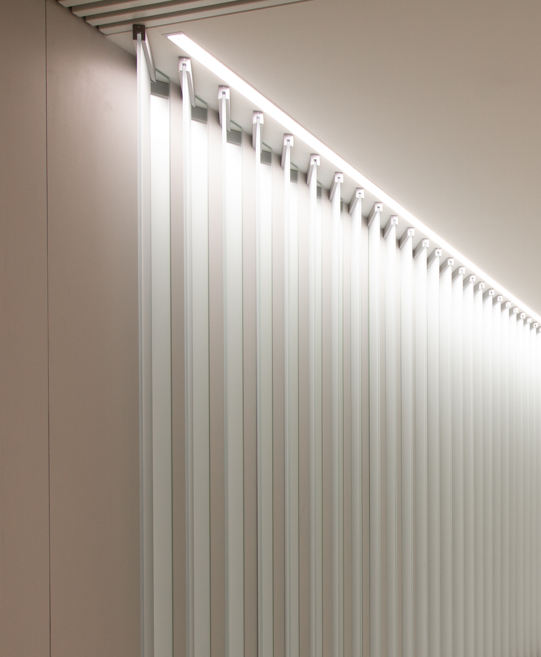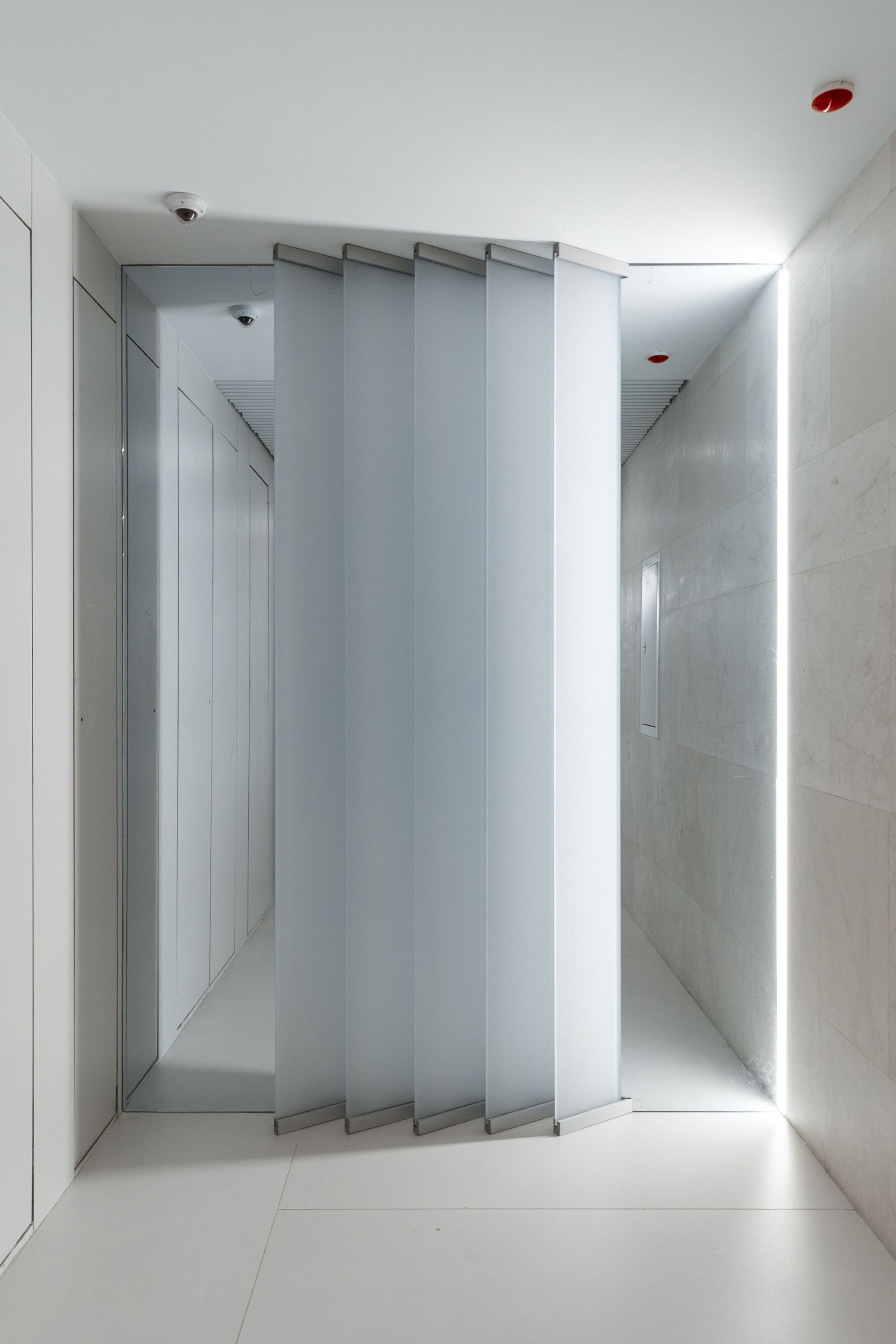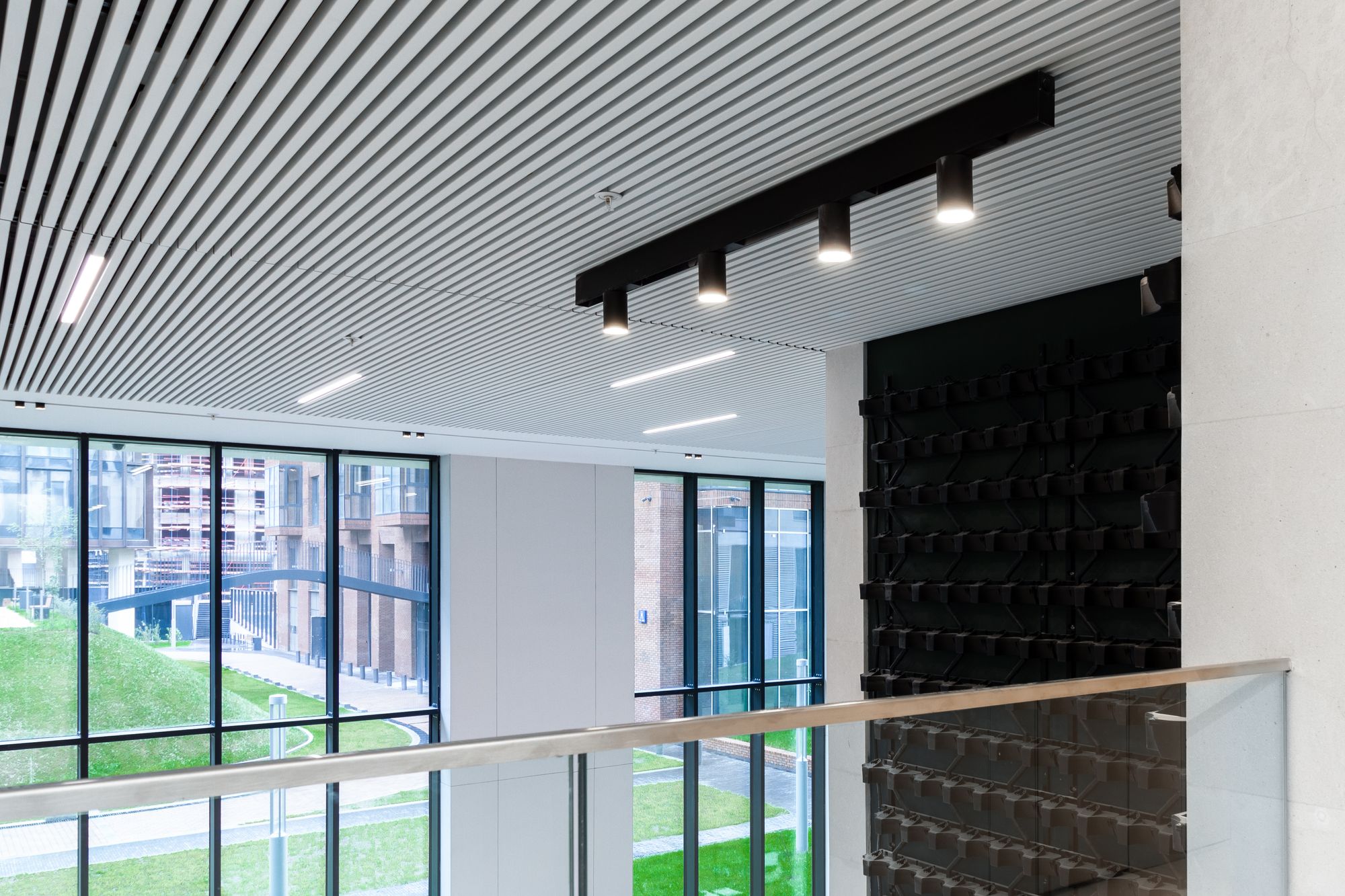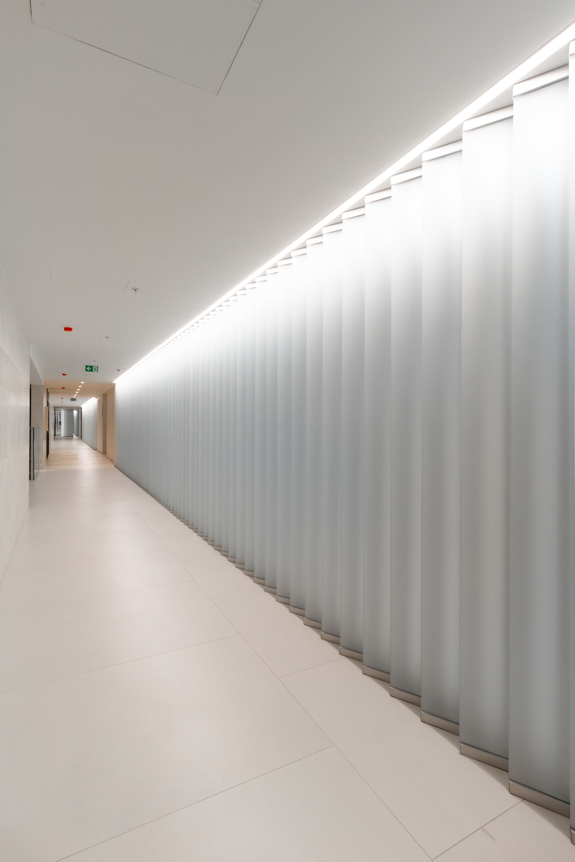 Простые и эстетичные линейные светильники идеально смотрятся в коридорных и лифтовых зонах с лаконичным дизайном. Использование линейных светильников разных размеров подчеркивает индивидуальность пространства и создает качественное освещение. Черные подвесные светильники добавляют светлым стенам и потолку контраста. Анодированные профили со светодиодными лентами интегрированы в стены и похожи на естественное солнечное освещение, проникающее внутрь здания через приоткрытую дверь. Ленты дневного и теплого белого свечения создают атмосферу солнечного дня внутри жилого комплекса в любое время суток. Светодиодные ленты и светильники применяются для основного и декоративного освещения во всех общественных зонах здания.